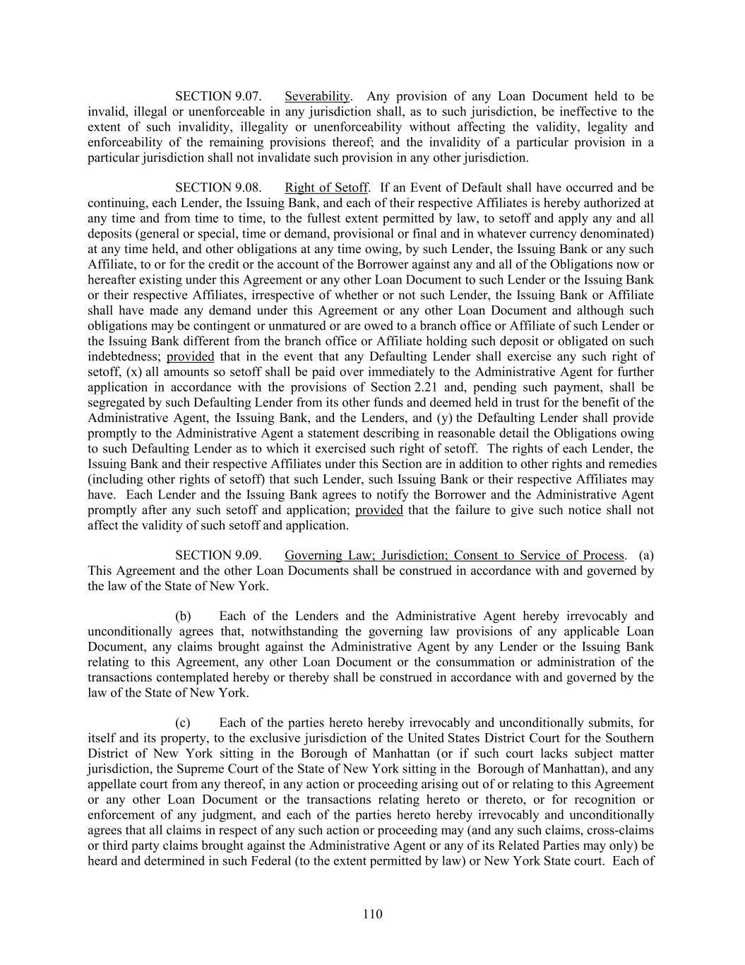 SECTION 9.07. Severability. Any provision of any Loan Document held to be invalid, illegal or unenforceable in any jurisdiction shall, as to such jurisdiction, be ineffective to the extent of such invalidity, illegality or unenforceability without affecting the validity, legality and enforceability of the remaining provisions thereof; and the invalidity of a particular provision in a particular jurisdiction shall not invalidate such provision in any other jurisdiction. SECTION 9.08. Right of Setoff. If an Event of Default shall have occurred and be continuing, each Lender, the Issuing Bank, and each of their respective Affiliates is hereby authorized at any time and from time to time, to the fullest extent permitted by law, to setoff and apply any and all deposits (general or special, time or demand, provisional or final and in whatever currency denominated) at any time held, and other obligations at any time owing, by such Lender, the Issuing Bank or any such Affiliate, to or for the credit or the account of the Borrower against any and all of the Obligations now or hereafter existing under this Agreement or any other Loan Document to such Lender or the Issuing Bank or their respective Affiliates, irrespective of whether or not such Lender, the Issuing Bank or Affiliate shall have made any demand under this Agreement or any other Loan Document and although such obligations may be contingent or unmatured or are owed to a branch office or Affiliate of such Lender or the Issuing Bank different from the branch office or Affiliate holding such deposit or obligated on such indebtedness; provided that in the event that any Defaulting Lender shall exercise any such right of setoff, (x) all amounts so setoff shall be paid over immediately to the Administrative Agent for further application in accordance with the provisions of Section 2.21 and, pending such payment, shall be segregated by such Defaulting Lender from its other funds and deemed held in trust for the benefit of the Administrative Agent, the Issuing Bank, and the Lenders, and (y) the Defaulting Lender shall provide promptly to the Administrative Agent a statement describing in reasonable detail the Obligations owing to such Defaulting Lender as to which it exercised such right of setoff. The rights of each Lender, the Issuing Bank and their respective Affiliates under this Section are in addition to other rights and remedies (including other rights of setoff) that such Lender, such Issuing Bank or their respective Affiliates may have. Each Lender and the Issuing Bank agrees to notify the Borrower and the Administrative Agent promptly after any such setoff and application; provided that the failure to give such notice shall not affect the validity of such setoff and application. SECTION 9.09. Governing Law; Jurisdiction; Consent to Service of Process. (a) This Agreement and the other Loan Documents shall be construed in accordance with and governed by the law of the State of New York. (b) Each of the Lenders and the Administrative Agent hereby irrevocably and unconditionally agrees that, notwithstanding the governing law provisions of any applicable Loan Document, any claims brought against the Administrative Agent by any Lender or the Issuing Bank relating to this Agreement, any other Loan Document or the consummation or administration of the transactions contemplated hereby or thereby shall be construed in accordance with and governed by the law of the State of New York. (c) Each of the parties hereto hereby irrevocably and unconditionally submits, for itself and its property, to the exclusive jurisdiction of the United States District Court for the Southern District of New York sitting in the Borough of Manhattan (or if such court lacks subject matter jurisdiction, the Supreme Court of the State of New York sitting in the Borough of Manhattan), and any appellate court from any thereof, in any action or proceeding arising out of or relating to this Agreement or any other Loan Document or the transactions relating hereto or thereto, or for recognition or enforcement of any judgment, and each of the parties hereto hereby irrevocably and unconditionally agrees that all claims in respect of any such action or proceeding may (and any such claims, cross-claims or third party claims brought against the Administrative Agent or any of its Related Parties may only) be heard and determined in such Federal (to the extent permitted by law) or New York State court. Each of 110