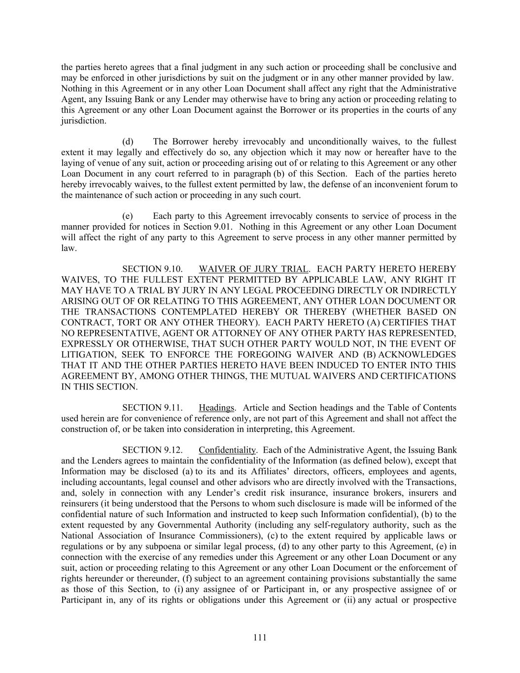 the parties hereto agrees that a final judgment in any such action or proceeding shall be conclusive and may be enforced in other jurisdictions by suit on the judgment or in any other manner provided by law. Nothing in this Agreement or in any other Loan Document shall affect any right that the Administrative Agent, any Issuing Bank or any Lender may otherwise have to bring any action or proceeding relating to this Agreement or any other Loan Document against the Borrower or its properties in the courts of any jurisdiction. (d) The Borrower hereby irrevocably and unconditionally waives, to the fullest extent it may legally and effectively do so, any objection which it may now or hereafter have to the laying of venue of any suit, action or proceeding arising out of or relating to this Agreement or any other Loan Document in any court referred to in paragraph (b) of this Section. Each of the parties hereto hereby irrevocably waives, to the fullest extent permitted by law, the defense of an inconvenient forum to the maintenance of such action or proceeding in any such court. (e) Each party to this Agreement irrevocably consents to service of process in the manner provided for notices in Section 9.01. Nothing in this Agreement or any other Loan Document will affect the right of any party to this Agreement to serve process in any other manner permitted by law. SECTION 9.10. WAIVER OF JURY TRIAL. EACH PARTY HERETO HEREBY WAIVES, TO THE FULLEST EXTENT PERMITTED BY APPLICABLE LAW, ANY RIGHT IT MAY HAVE TO A TRIAL BY JURY IN ANY LEGAL PROCEEDING DIRECTLY OR INDIRECTLY ARISING OUT OF OR RELATING TO THIS AGREEMENT, ANY OTHER LOAN DOCUMENT OR THE TRANSACTIONS CONTEMPLATED HEREBY OR THEREBY (WHETHER BASED ON CONTRACT, TORT OR ANY OTHER THEORY). EACH PARTY HERETO (A) CERTIFIES THAT NO REPRESENTATIVE, AGENT OR ATTORNEY OF ANY OTHER PARTY HAS REPRESENTED, EXPRESSLY OR OTHERWISE, THAT SUCH OTHER PARTY WOULD NOT, IN THE EVENT OF LITIGATION, SEEK TO ENFORCE THE FOREGOING WAIVER AND (B) ACKNOWLEDGES THAT IT AND THE OTHER PARTIES HERETO HAVE BEEN INDUCED TO ENTER INTO THIS AGREEMENT BY, AMONG OTHER THINGS, THE MUTUAL WAIVERS AND CERTIFICATIONS IN THIS SECTION. SECTION 9.11. Headings. Article and Section headings and the Table of Contents used herein are for convenience of reference only, are not part of this Agreement and shall not affect the construction of, or be taken into consideration in interpreting, this Agreement. SECTION 9.12. Confidentiality. Each of the Administrative Agent, the Issuing Bank and the Lenders agrees to maintain the confidentiality of the Information (as defined below), except that Information may be disclosed (a) to its and its Affiliates’ directors, officers, employees and agents, including accountants, legal counsel and other advisors who are directly involved with the Transactions, and, solely in connection with any Lender’s credit risk insurance, insurance brokers, insurers and reinsurers (it being understood that the Persons to whom such disclosure is made will be informed of the confidential nature of such Information and instructed to keep such Information confidential), (b) to the extent requested by any Governmental Authority (including any self-regulatory authority, such as the National Association of Insurance Commissioners), (c) to the extent required by applicable laws or regulations or by any subpoena or similar legal process, (d) to any other party to this Agreement, (e) in connection with the exercise of any remedies under this Agreement or any other Loan Document or any suit, action or proceeding relating to this Agreement or any other Loan Document or the enforcement of rights hereunder or thereunder, (f) subject to an agreement containing provisions substantially the same as those of this Section, to (i) any assignee of or Participant in, or any prospective assignee of or Participant in, any of its rights or obligations under this Agreement or (ii) any actual or prospective 111