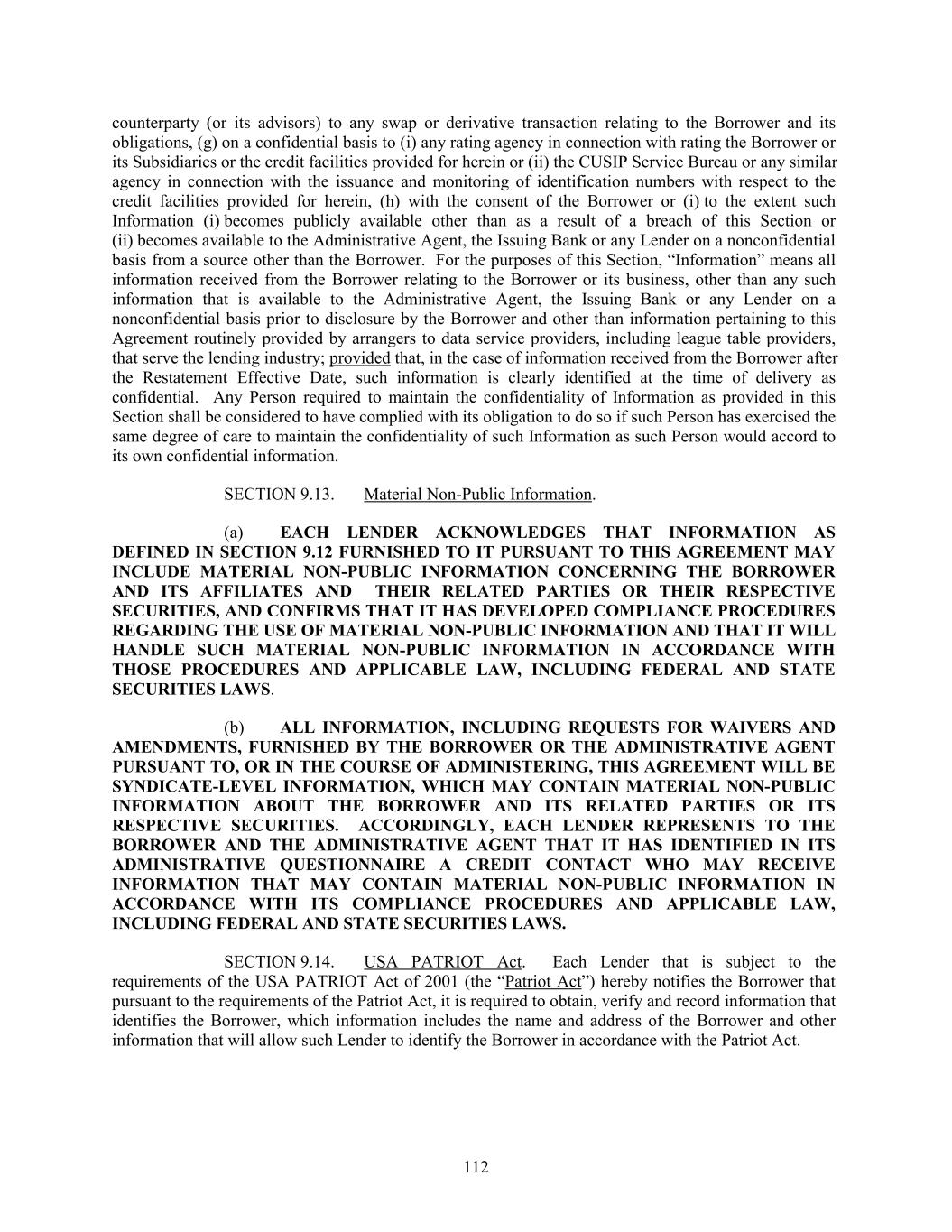 counterparty (or its advisors) to any swap or derivative transaction relating to the Borrower and its obligations, (g) on a confidential basis to (i) any rating agency in connection with rating the Borrower or its Subsidiaries or the credit facilities provided for herein or (ii) the CUSIP Service Bureau or any similar agency in connection with the issuance and monitoring of identification numbers with respect to the credit facilities provided for herein, (h) with the consent of the Borrower or (i) to the extent such Information (i) becomes publicly available other than as a result of a breach of this Section or (ii) becomes available to the Administrative Agent, the Issuing Bank or any Lender on a nonconfidential basis from a source other than the Borrower. For the purposes of this Section, “Information” means all information received from the Borrower relating to the Borrower or its business, other than any such information that is available to the Administrative Agent, the Issuing Bank or any Lender on a nonconfidential basis prior to disclosure by the Borrower and other than information pertaining to this Agreement routinely provided by arrangers to data service providers, including league table providers, that serve the lending industry; provided that, in the case of information received from the Borrower after the Restatement Effective Date, such information is clearly identified at the time of delivery as confidential. Any Person required to maintain the confidentiality of Information as provided in this Section shall be considered to have complied with its obligation to do so if such Person has exercised the same degree of care to maintain the confidentiality of such Information as such Person would accord to its own confidential information. SECTION 9.13. Material Non-Public Information. (a) EACH LENDER ACKNOWLEDGES THAT INFORMATION AS DEFINED IN SECTION 9.12 FURNISHED TO IT PURSUANT TO THIS AGREEMENT MAY INCLUDE MATERIAL NON-PUBLIC INFORMATION CONCERNING THE BORROWER AND ITS AFFILIATES AND THEIR RELATED PARTIES OR THEIR RESPECTIVE SECURITIES, AND CONFIRMS THAT IT HAS DEVELOPED COMPLIANCE PROCEDURES REGARDING THE USE OF MATERIAL NON-PUBLIC INFORMATION AND THAT IT WILL HANDLE SUCH MATERIAL NON-PUBLIC INFORMATION IN ACCORDANCE WITH THOSE PROCEDURES AND APPLICABLE LAW, INCLUDING FEDERAL AND STATE SECURITIES LAWS. (b) ALL INFORMATION, INCLUDING REQUESTS FOR WAIVERS AND AMENDMENTS, FURNISHED BY THE BORROWER OR THE ADMINISTRATIVE AGENT PURSUANT TO, OR IN THE COURSE OF ADMINISTERING, THIS AGREEMENT WILL BE SYNDICATE-LEVEL INFORMATION, WHICH MAY CONTAIN MATERIAL NON-PUBLIC INFORMATION ABOUT THE BORROWER AND ITS RELATED PARTIES OR ITS RESPECTIVE SECURITIES. ACCORDINGLY, EACH LENDER REPRESENTS TO THE BORROWER AND THE ADMINISTRATIVE AGENT THAT IT HAS IDENTIFIED IN ITS ADMINISTRATIVE QUESTIONNAIRE A CREDIT CONTACT WHO MAY RECEIVE INFORMATION THAT MAY CONTAIN MATERIAL NON-PUBLIC INFORMATION IN ACCORDANCE WITH ITS COMPLIANCE PROCEDURES AND APPLICABLE LAW, INCLUDING FEDERAL AND STATE SECURITIES LAWS. SECTION 9.14. USA PATRIOT Act. Each Lender that is subject to the requirements of the USA PATRIOT Act of 2001 (the “Patriot Act”) hereby notifies the Borrower that pursuant to the requirements of the Patriot Act, it is required to obtain, verify and record information that identifies the Borrower, which information includes the name and address of the Borrower and other information that will allow such Lender to identify the Borrower in accordance with the Patriot Act. 112