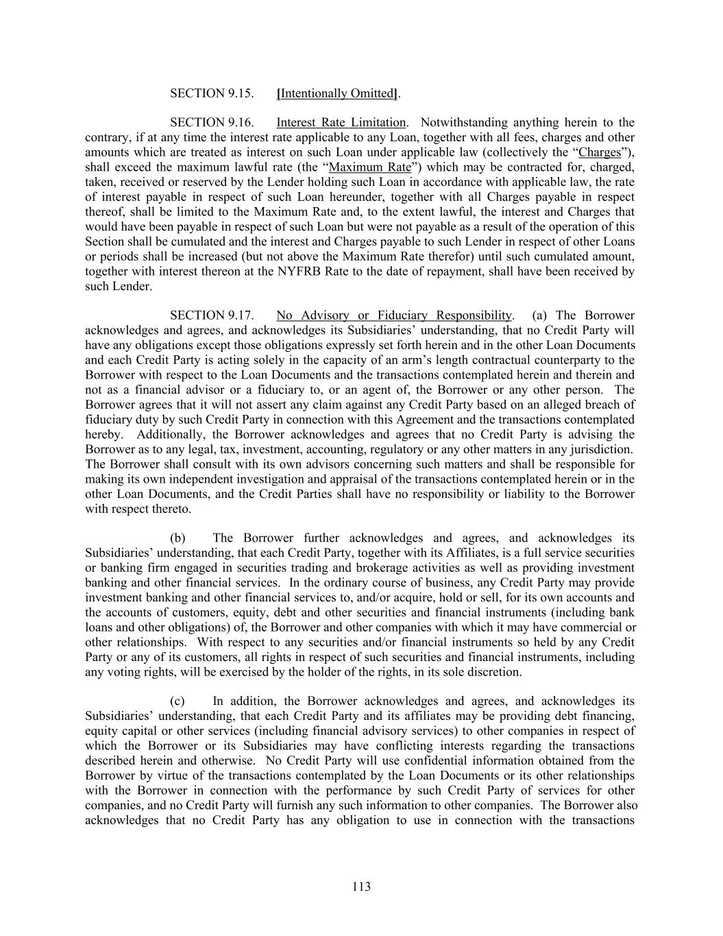 SECTION 9.15. [Intentionally Omitted]. SECTION 9.16. Interest Rate Limitation. Notwithstanding anything herein to the contrary, if at any time the interest rate applicable to any Loan, together with all fees, charges and other amounts which are treated as interest on such Loan under applicable law (collectively the “Charges”), shall exceed the maximum lawful rate (the “Maximum Rate”) which may be contracted for, charged, taken, received or reserved by the Lender holding such Loan in accordance with applicable law, the rate of interest payable in respect of such Loan hereunder, together with all Charges payable in respect thereof, shall be limited to the Maximum Rate and, to the extent lawful, the interest and Charges that would have been payable in respect of such Loan but were not payable as a result of the operation of this Section shall be cumulated and the interest and Charges payable to such Lender in respect of other Loans or periods shall be increased (but not above the Maximum Rate therefor) until such cumulated amount, together with interest thereon at the NYFRB Rate to the date of repayment, shall have been received by such Lender. SECTION 9.17. No Advisory or Fiduciary Responsibility. (a) The Borrower acknowledges and agrees, and acknowledges its Subsidiaries’ understanding, that no Credit Party will have any obligations except those obligations expressly set forth herein and in the other Loan Documents and each Credit Party is acting solely in the capacity of an arm’s length contractual counterparty to the Borrower with respect to the Loan Documents and the transactions contemplated herein and therein and not as a financial advisor or a fiduciary to, or an agent of, the Borrower or any other person. The Borrower agrees that it will not assert any claim against any Credit Party based on an alleged breach of fiduciary duty by such Credit Party in connection with this Agreement and the transactions contemplated hereby. Additionally, the Borrower acknowledges and agrees that no Credit Party is advising the Borrower as to any legal, tax, investment, accounting, regulatory or any other matters in any jurisdiction. The Borrower shall consult with its own advisors concerning such matters and shall be responsible for making its own independent investigation and appraisal of the transactions contemplated herein or in the other Loan Documents, and the Credit Parties shall have no responsibility or liability to the Borrower with respect thereto. (b) The Borrower further acknowledges and agrees, and acknowledges its Subsidiaries’ understanding, that each Credit Party, together with its Affiliates, is a full service securities or banking firm engaged in securities trading and brokerage activities as well as providing investment banking and other financial services. In the ordinary course of business, any Credit Party may provide investment banking and other financial services to, and/or acquire, hold or sell, for its own accounts and the accounts of customers, equity, debt and other securities and financial instruments (including bank loans and other obligations) of, the Borrower and other companies with which it may have commercial or other relationships. With respect to any securities and/or financial instruments so held by any Credit Party or any of its customers, all rights in respect of such securities and financial instruments, including any voting rights, will be exercised by the holder of the rights, in its sole discretion. (c) In addition, the Borrower acknowledges and agrees, and acknowledges its Subsidiaries’ understanding, that each Credit Party and its affiliates may be providing debt financing, equity capital or other services (including financial advisory services) to other companies in respect of which the Borrower or its Subsidiaries may have conflicting interests regarding the transactions described herein and otherwise. No Credit Party will use confidential information obtained from the Borrower by virtue of the transactions contemplated by the Loan Documents or its other relationships with the Borrower in connection with the performance by such Credit Party of services for other companies, and no Credit Party will furnish any such information to other companies. The Borrower also acknowledges that no Credit Party has any obligation to use in connection with the transactions 113