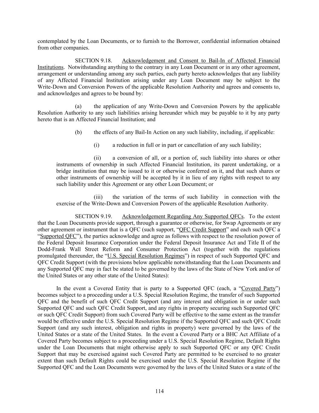 contemplated by the Loan Documents, or to furnish to the Borrower, confidential information obtained from other companies. SECTION 9.18. Acknowledgement and Consent to Bail-In of Affected Financial Institutions. Notwithstanding anything to the contrary in any Loan Document or in any other agreement, arrangement or understanding among any such parties, each party hereto acknowledges that any liability of any Affected Financial Institution arising under any Loan Document may be subject to the Write-Down and Conversion Powers of the applicable Resolution Authority and agrees and consents to, and acknowledges and agrees to be bound by: (a) the application of any Write-Down and Conversion Powers by the applicable Resolution Authority to any such liabilities arising hereunder which may be payable to it by any party hereto that is an Affected Financial Institution; and (b) the effects of any Bail-In Action on any such liability, including, if applicable: (i) a reduction in full or in part or cancellation of any such liability; (ii) a conversion of all, or a portion of, such liability into shares or other instruments of ownership in such Affected Financial Institution, its parent undertaking, or a bridge institution that may be issued to it or otherwise conferred on it, and that such shares or other instruments of ownership will be accepted by it in lieu of any rights with respect to any such liability under this Agreement or any other Loan Document; or (iii) the variation of the terms of such liability in connection with the exercise of the Write-Down and Conversion Powers of the applicable Resolution Authority. SECTION 9.19. Acknowledgement Regarding Any Supported QFCs. To the extent that the Loan Documents provide support, through a guarantee or otherwise, for Swap Agreements or any other agreement or instrument that is a QFC (such support, “QFC Credit Support” and each such QFC a “Supported QFC”), the parties acknowledge and agree as follows with respect to the resolution power of the Federal Deposit Insurance Corporation under the Federal Deposit Insurance Act and Title II of the Dodd-Frank Wall Street Reform and Consumer Protection Act (together with the regulations promulgated thereunder, the “U.S. Special Resolution Regimes”) in respect of such Supported QFC and QFC Credit Support (with the provisions below applicable notwithstanding that the Loan Documents and any Supported QFC may in fact be stated to be governed by the laws of the State of New York and/or of the United States or any other state of the United States): In the event a Covered Entity that is party to a Supported QFC (each, a “Covered Party”) becomes subject to a proceeding under a U.S. Special Resolution Regime, the transfer of such Supported QFC and the benefit of such QFC Credit Support (and any interest and obligation in or under such Supported QFC and such QFC Credit Support, and any rights in property securing such Supported QFC or such QFC Credit Support) from such Covered Party will be effective to the same extent as the transfer would be effective under the U.S. Special Resolution Regime if the Supported QFC and such QFC Credit Support (and any such interest, obligation and rights in property) were governed by the laws of the United States or a state of the United States. In the event a Covered Party or a BHC Act Affiliate of a Covered Party becomes subject to a proceeding under a U.S. Special Resolution Regime, Default Rights under the Loan Documents that might otherwise apply to such Supported QFC or any QFC Credit Support that may be exercised against such Covered Party are permitted to be exercised to no greater extent than such Default Rights could be exercised under the U.S. Special Resolution Regime if the Supported QFC and the Loan Documents were governed by the laws of the United States or a state of the 114