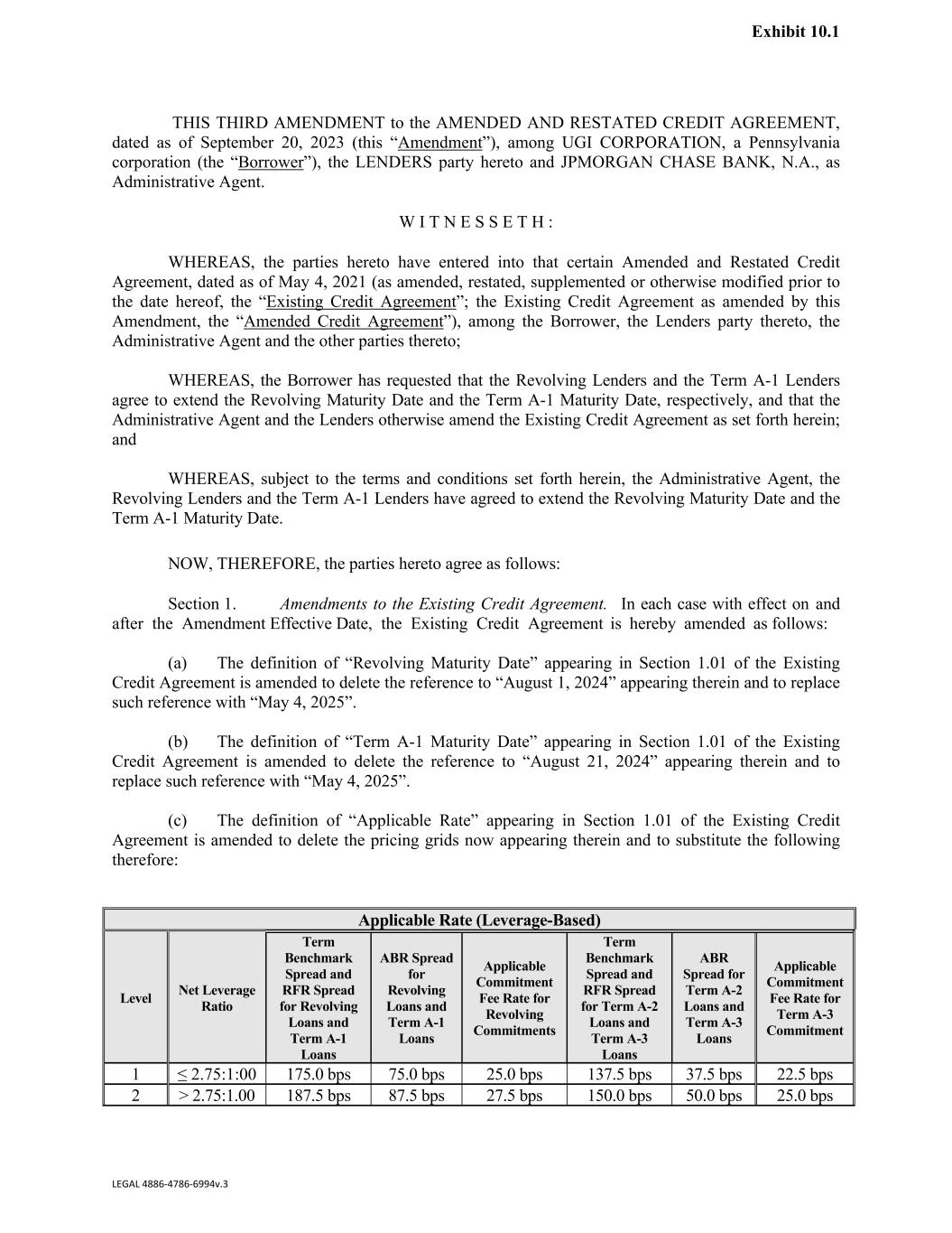 Exhibit 10.1 THIS THIRD AMENDMENT to the AMENDED AND RESTATED CREDIT AGREEMENT, dated as of September 20, 2023 (this “Amendment”), among UGI CORPORATION, a Pennsylvania corporation (the “Borrower”), the LENDERS party hereto and JPMORGAN CHASE BANK, N.A., as Administrative Agent. W I T N E S S E T H : WHEREAS, the parties hereto have entered into that certain Amended and Restated Credit Agreement, dated as of May 4, 2021 (as amended, restated, supplemented or otherwise modified prior to the date hereof, the “Existing Credit Agreement”; the Existing Credit Agreement as amended by this Amendment, the “Amended Credit Agreement”), among the Borrower, the Lenders party thereto, the Administrative Agent and the other parties thereto; WHEREAS, the Borrower has requested that the Revolving Lenders and the Term A-1 Lenders agree to extend the Revolving Maturity Date and the Term A-1 Maturity Date, respectively, and that the Administrative Agent and the Lenders otherwise amend the Existing Credit Agreement as set forth herein; and WHEREAS, subject to the terms and conditions set forth herein, the Administrative Agent, the Revolving Lenders and the Term A-1 Lenders have agreed to extend the Revolving Maturity Date and the Term A-1 Maturity Date. NOW, THEREFORE, the parties hereto agree as follows: Section 1. Amendments to the Existing Credit Agreement. In each case with effect on and after the Amendment Effective Date, the Existing Credit Agreement is hereby amended as follows: (a) The definition of “Revolving Maturity Date” appearing in Section 1.01 of the Existing Credit Agreement is amended to delete the reference to “August 1, 2024” appearing therein and to replace such reference with “May 4, 2025”. (b) The definition of “Term A-1 Maturity Date” appearing in Section 1.01 of the Existing Credit Agreement is amended to delete the reference to “August 21, 2024” appearing therein and to replace such reference with “May 4, 2025”. (c) The definition of “Applicable Rate” appearing in Section 1.01 of the Existing Credit Agreement is amended to delete the pricing grids now appearing therein and to substitute the following therefore: Applicable Rate (Leverage-Based) Level Net Leverage Ratio Term Benchmark Spread and RFR Spread for Revolving Loans and Term A-1 Loans ABR Spread for Revolving Loans and Term A-1 Loans Applicable Commitment Fee Rate for Revolving Commitments Term Benchmark Spread and RFR Spread for Term A-2 Loans and Term A-3 Loans ABR Spread for Term A-2 Loans and Term A-3 Loans Applicable Commitment Fee Rate for Term A-3 Commitment 1 ≤ 2.75:1:00 175.0 bps 75.0 bps 25.0 bps 137.5 bps 37.5 bps 22.5 bps 2 > 2.75:1.00 187.5 bps 87.5 bps 27.5 bps 150.0 bps 50.0 bps 25.0 bps LEGAL 4886‐4786‐6994v.3