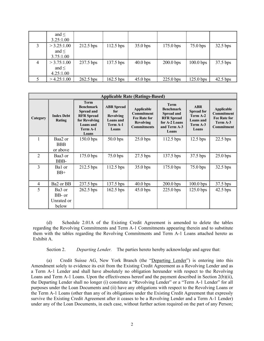 2  and ≤ 3.25:1.00 3 > 3.25:1.00 and ≤ 3.75:1.00 212.5 bps 112.5 bps 35.0 bps 175.0 bps 75.0 bps 32.5 bps 4 > 3.75:1.00 and ≤ 4.25:1.00 237.5 bps 137.5 bps 40.0 bps 200.0 bps 100.0 bps 37.5 bps 5 > 4.25:1.00 262.5 bps 162.5 bps 45.0 bps 225.0 bps 125.0 bps 42.5 bps Applicable Rate (Ratings-Based) Category Index Debt Rating Term Benchmark Spread and RFR Spread for Revolving Loans and Term A-1 Loans ABR Spread for Revolving Loans and Term A-1 Loans Applicable Commitment Fee Rate for Revolving Commitments Term Benchmark Spread and RFR Spread for A-2 Loans and Term A-3 Loans ABR Spread for Term A-2 Loans and Term A-3 Loans Applicable Commitment Fee Rate for Term A-3 Commitment 1 Baa2 or BBB or above 150.0 bps 50.0 bps 25.0 bps 112.5 bps 12.5 bps 22.5 bps 2 Baa3 or BBB- 175.0 bps 75.0 bps 27.5 bps 137.5 bps 37.5 bps 25.0 bps 3 Ba1 or BB+ 212.5 bps 112.5 bps 35.0 bps 175.0 bps 75.0 bps 32.5 bps 4 Ba2 or BB 237.5 bps 137.5 bps 40.0 bps 200.0 bps 100.0 bps 37.5 bps 5 Ba3 or BB- or Unrated or below 262.5 bps 162.5 bps 45.0 bps 225.0 bps 125.0 bps 42.5 bps (d) Schedule 2.01A of the Existing Credit Agreement is amended to delete the tables regarding the Revolving Commitments and Term A-1 Commitments appearing therein and to substitute them with the tables regarding the Revolving Commitments and Term A-1 Loans attached hereto as Exhibit A. Section 2. Departing Lender. The parties hereto hereby acknowledge and agree that: (a) Credit Suisse AG, New York Branch (the “Departing Lender”) is entering into this Amendment solely to evidence its exit from the Existing Credit Agreement as a Revolving Lender and as a Term A-1 Lender and shall have absolutely no obligation hereunder with respect to the Revolving Loans and Term A-1 Loans. Upon the effectiveness hereof and the payment described in Section 2(b)(ii), the Departing Lender shall no longer (i) constitute a “Revolving Lender” or a “Term A-1 Lender” for all purposes under the Loan Documents and (ii) have any obligations with respect to the Revolving Loans or the Term A-1 Loans (other than any of its obligations under the Existing Credit Agreement that expressly survive the Existing Credit Agreement after it ceases to be a Revolving Lender and a Term A-1 Lender) under any of the Loan Documents, in each case, without further action required on the part of any Person;