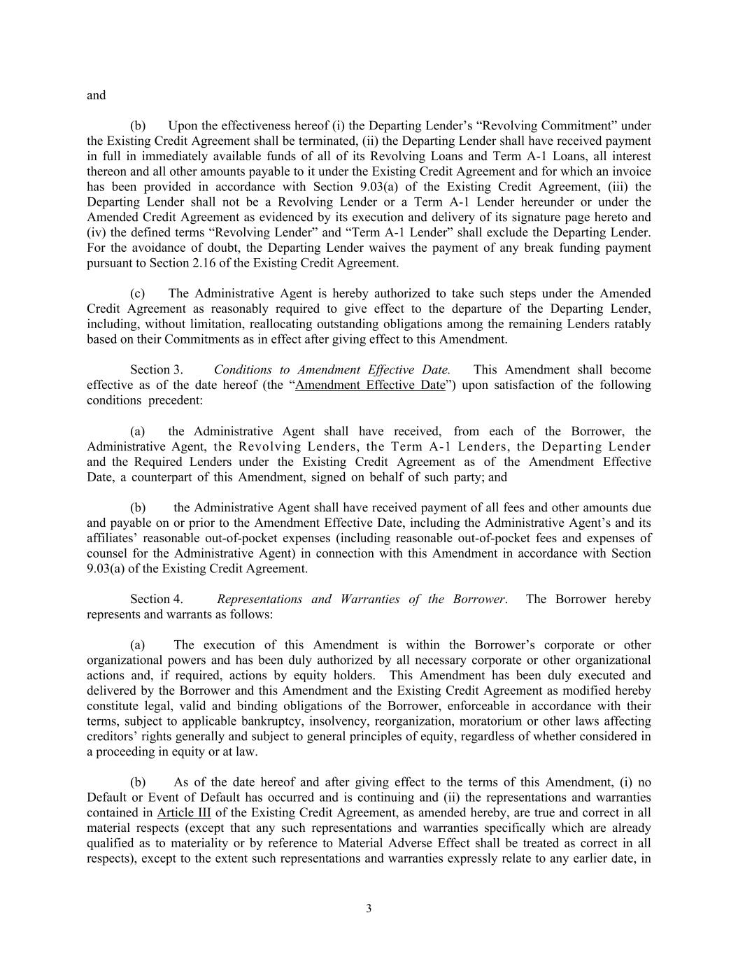 3  and (b) Upon the effectiveness hereof (i) the Departing Lender’s “Revolving Commitment” under the Existing Credit Agreement shall be terminated, (ii) the Departing Lender shall have received payment in full in immediately available funds of all of its Revolving Loans and Term A-1 Loans, all interest thereon and all other amounts payable to it under the Existing Credit Agreement and for which an invoice has been provided in accordance with Section 9.03(a) of the Existing Credit Agreement, (iii) the Departing Lender shall not be a Revolving Lender or a Term A-1 Lender hereunder or under the Amended Credit Agreement as evidenced by its execution and delivery of its signature page hereto and (iv) the defined terms “Revolving Lender” and “Term A-1 Lender” shall exclude the Departing Lender. For the avoidance of doubt, the Departing Lender waives the payment of any break funding payment pursuant to Section 2.16 of the Existing Credit Agreement. (c) The Administrative Agent is hereby authorized to take such steps under the Amended Credit Agreement as reasonably required to give effect to the departure of the Departing Lender, including, without limitation, reallocating outstanding obligations among the remaining Lenders ratably based on their Commitments as in effect after giving effect to this Amendment. Section 3. Conditions to Amendment Effective Date. This Amendment shall become effective as of the date hereof (the “Amendment Effective Date”) upon satisfaction of the following conditions precedent: (a) the Administrative Agent shall have received, from each of the Borrower, the Administrative Agent, the Revolving Lenders, the Term A-1 Lenders, the Departing Lender and the Required Lenders under the Existing Credit Agreement as of the Amendment Effective Date, a counterpart of this Amendment, signed on behalf of such party; and (b) the Administrative Agent shall have received payment of all fees and other amounts due and payable on or prior to the Amendment Effective Date, including the Administrative Agent’s and its affiliates’ reasonable out-of-pocket expenses (including reasonable out-of-pocket fees and expenses of counsel for the Administrative Agent) in connection with this Amendment in accordance with Section 9.03(a) of the Existing Credit Agreement. Section 4. Representations and Warranties of the Borrower. The Borrower hereby represents and warrants as follows: (a) The execution of this Amendment is within the Borrower’s corporate or other organizational powers and has been duly authorized by all necessary corporate or other organizational actions and, if required, actions by equity holders. This Amendment has been duly executed and delivered by the Borrower and this Amendment and the Existing Credit Agreement as modified hereby constitute legal, valid and binding obligations of the Borrower, enforceable in accordance with their terms, subject to applicable bankruptcy, insolvency, reorganization, moratorium or other laws affecting creditors’ rights generally and subject to general principles of equity, regardless of whether considered in a proceeding in equity or at law. (b) As of the date hereof and after giving effect to the terms of this Amendment, (i) no Default or Event of Default has occurred and is continuing and (ii) the representations and warranties contained in Article III of the Existing Credit Agreement, as amended hereby, are true and correct in all material respects (except that any such representations and warranties specifically which are already qualified as to materiality or by reference to Material Adverse Effect shall be treated as correct in all respects), except to the extent such representations and warranties expressly relate to any earlier date, in