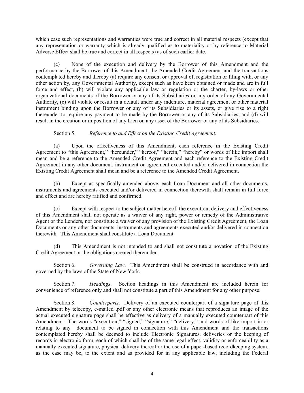 4  which case such representations and warranties were true and correct in all material respects (except that any representation or warranty which is already qualified as to materiality or by reference to Material Adverse Effect shall be true and correct in all respects) as of such earlier date. (c) None of the execution and delivery by the Borrower of this Amendment and the performance by the Borrower of this Amendment, the Amended Credit Agreement and the transactions contemplated hereby and thereby (a) require any consent or approval of, registration or filing with, or any other action by, any Governmental Authority, except such as have been obtained or made and are in full force and effect, (b) will violate any applicable law or regulation or the charter, by-laws or other organizational documents of the Borrower or any of its Subsidiaries or any order of any Governmental Authority, (c) will violate or result in a default under any indenture, material agreement or other material instrument binding upon the Borrower or any of its Subsidiaries or its assets, or give rise to a right thereunder to require any payment to be made by the Borrower or any of its Subsidiaries, and (d) will result in the creation or imposition of any Lien on any asset of the Borrower or any of its Subsidiaries. Section 5. Reference to and Effect on the Existing Credit Agreement. (a) Upon the effectiveness of this Amendment, each reference in the Existing Credit Agreement to “this Agreement,” “hereunder,” “hereof,” “herein,” “hereby” or words of like import shall mean and be a reference to the Amended Credit Agreement and each reference to the Existing Credit Agreement in any other document, instrument or agreement executed and/or delivered in connection the Existing Credit Agreement shall mean and be a reference to the Amended Credit Agreement. (b) Except as specifically amended above, each Loan Document and all other documents, instruments and agreements executed and/or delivered in connection therewith shall remain in full force and effect and are hereby ratified and confirmed. (c) Except with respect to the subject matter hereof, the execution, delivery and effectiveness of this Amendment shall not operate as a waiver of any right, power or remedy of the Administrative Agent or the Lenders, nor constitute a waiver of any provision of the Existing Credit Agreement, the Loan Documents or any other documents, instruments and agreements executed and/or delivered in connection therewith. This Amendment shall constitute a Loan Document. (d) This Amendment is not intended to and shall not constitute a novation of the Existing Credit Agreement or the obligations created thereunder. Section 6. Governing Law. This Amendment shall be construed in accordance with and governed by the laws of the State of New York. Section 7. Headings. Section headings in this Amendment are included herein for convenience of reference only and shall not constitute a part of this Amendment for any other purpose. Section 8. Counterparts. Delivery of an executed counterpart of a signature page of this Amendment by telecopy, e-mailed .pdf or any other electronic means that reproduces an image of the actual executed signature page shall be effective as delivery of a manually executed counterpart of this Amendment. The words “execution,” “signed,” “signature,” “delivery,” and words of like import in or relating to any document to be signed in connection with this Amendment and the transactions contemplated hereby shall be deemed to include Electronic Signatures, deliveries or the keeping of records in electronic form, each of which shall be of the same legal effect, validity or enforceability as a manually executed signature, physical delivery thereof or the use of a paper-based recordkeeping system, as the case may be, to the extent and as provided for in any applicable law, including the Federal