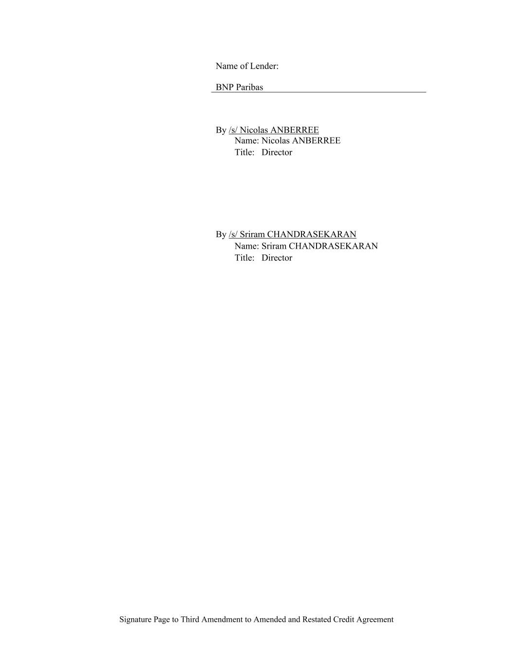 Signature Page to Third Amendment to Amended and Restated Credit Agreement Name of Lender: BNP Paribas By /s/ Nicolas ANBERREE Name: Nicolas ANBERREE Title: Director By /s/ Sriram CHANDRASEKARAN Name: Sriram CHANDRASEKARAN Title: Director