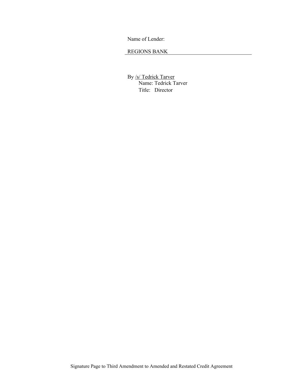 Signature Page to Third Amendment to Amended and Restated Credit Agreement Name of Lender: REGIONS BANK By /s/ Tedrick Tarver Name: Tedrick Tarver Title: Director
