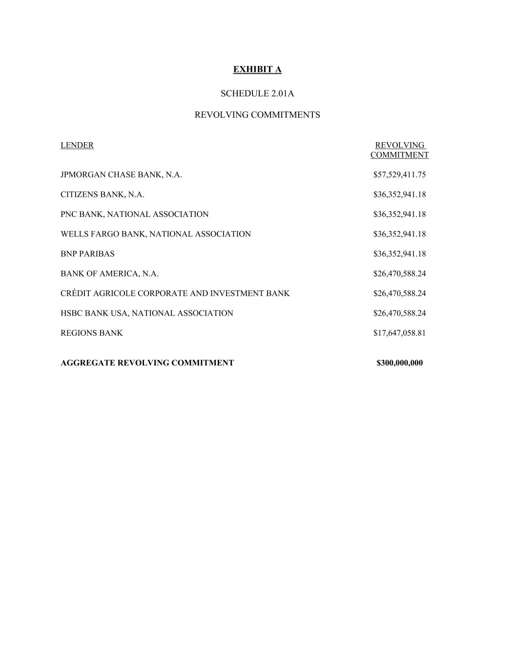 EXHIBIT A SCHEDULE 2.01A REVOLVING COMMITMENTS LENDER REVOLVING COMMITMENT JPMORGAN CHASE BANK, N.A. $57,529,411.75 CITIZENS BANK, N.A. $36,352,941.18 PNC BANK, NATIONAL ASSOCIATION $36,352,941.18 WELLS FARGO BANK, NATIONAL ASSOCIATION $36,352,941.18 BNP PARIBAS $36,352,941.18 BANK OF AMERICA, N.A. $26,470,588.24 CRÉDIT AGRICOLE CORPORATE AND INVESTMENT BANK $26,470,588.24 HSBC BANK USA, NATIONAL ASSOCIATION $26,470,588.24 REGIONS BANK $17,647,058.81 AGGREGATE REVOLVING COMMITMENT $300,000,000