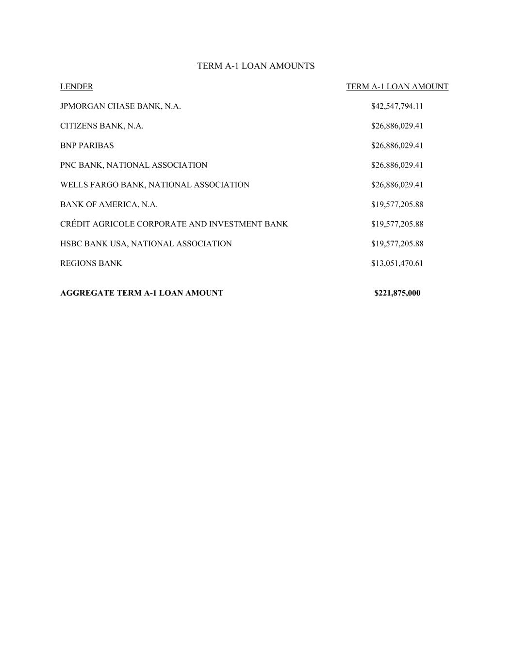 TERM A-1 LOAN AMOUNTS LENDER TERM A-1 LOAN AMOUNT JPMORGAN CHASE BANK, N.A. $42,547,794.11 CITIZENS BANK, N.A. $26,886,029.41 BNP PARIBAS $26,886,029.41 PNC BANK, NATIONAL ASSOCIATION $26,886,029.41 WELLS FARGO BANK, NATIONAL ASSOCIATION $26,886,029.41 BANK OF AMERICA, N.A. $19,577,205.88 CRÉDIT AGRICOLE CORPORATE AND INVESTMENT BANK $19,577,205.88 HSBC BANK USA, NATIONAL ASSOCIATION $19,577,205.88 REGIONS BANK $13,051,470.61 AGGREGATE TERM A-1 LOAN AMOUNT $221,875,000