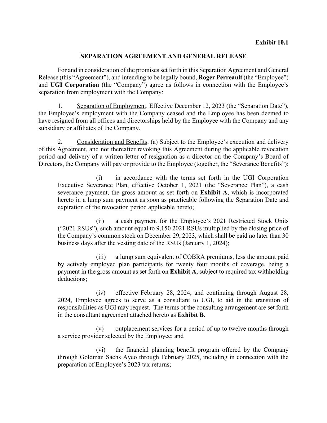 Exhibit 10.1 SEPARATION AGREEMENT AND GENERAL RELEASE For and in consideration of the promises set forth in this Separation Agreement and General Release (this “Agreement”), and intending to be legally bound, Roger Perreault (the “Employee”) and UGI Corporation (the “Company”) agree as follows in connection with the Employee’s separation from employment with the Company: 1. Separation of Employment. Effective December 12, 2023 (the “Separation Date”), the Employee’s employment with the Company ceased and the Employee has been deemed to have resigned from all offices and directorships held by the Employee with the Company and any subsidiary or affiliates of the Company. 2. Consideration and Benefits. (a) Subject to the Employee’s execution and delivery of this Agreement, and not thereafter revoking this Agreement during the applicable revocation period and delivery of a written letter of resignation as a director on the Company’s Board of Directors, the Company will pay or provide to the Employee (together, the “Severance Benefits”): (i) in accordance with the terms set forth in the UGI Corporation Executive Severance Plan, effective October 1, 2021 (the “Severance Plan”), a cash severance payment, the gross amount as set forth on Exhibit A, which is incorporated hereto in a lump sum payment as soon as practicable following the Separation Date and expiration of the revocation period applicable hereto; (ii) a cash payment for the Employee’s 2021 Restricted Stock Units (“2021 RSUs”), such amount equal to 9,150 2021 RSUs multiplied by the closing price of the Company’s common stock on December 29, 2023, which shall be paid no later than 30 business days after the vesting date of the RSUs (January 1, 2024); (iii) a lump sum equivalent of COBRA premiums, less the amount paid by actively employed plan participants for twenty four months of coverage, being a payment in the gross amount as set forth on Exhibit A, subject to required tax withholding deductions; (iv) effective February 28, 2024, and continuing through August 28, 2024, Employee agrees to serve as a consultant to UGI, to aid in the transition of responsibilities as UGI may request. The terms of the consulting arrangement are set forth in the consultant agreement attached hereto as Exhibit B. (v) outplacement services for a period of up to twelve months through a service provider selected by the Employee; and (vi) the financial planning benefit program offered by the Company through Goldman Sachs Ayco through February 2025, including in connection with the preparation of Employee’s 2023 tax returns;