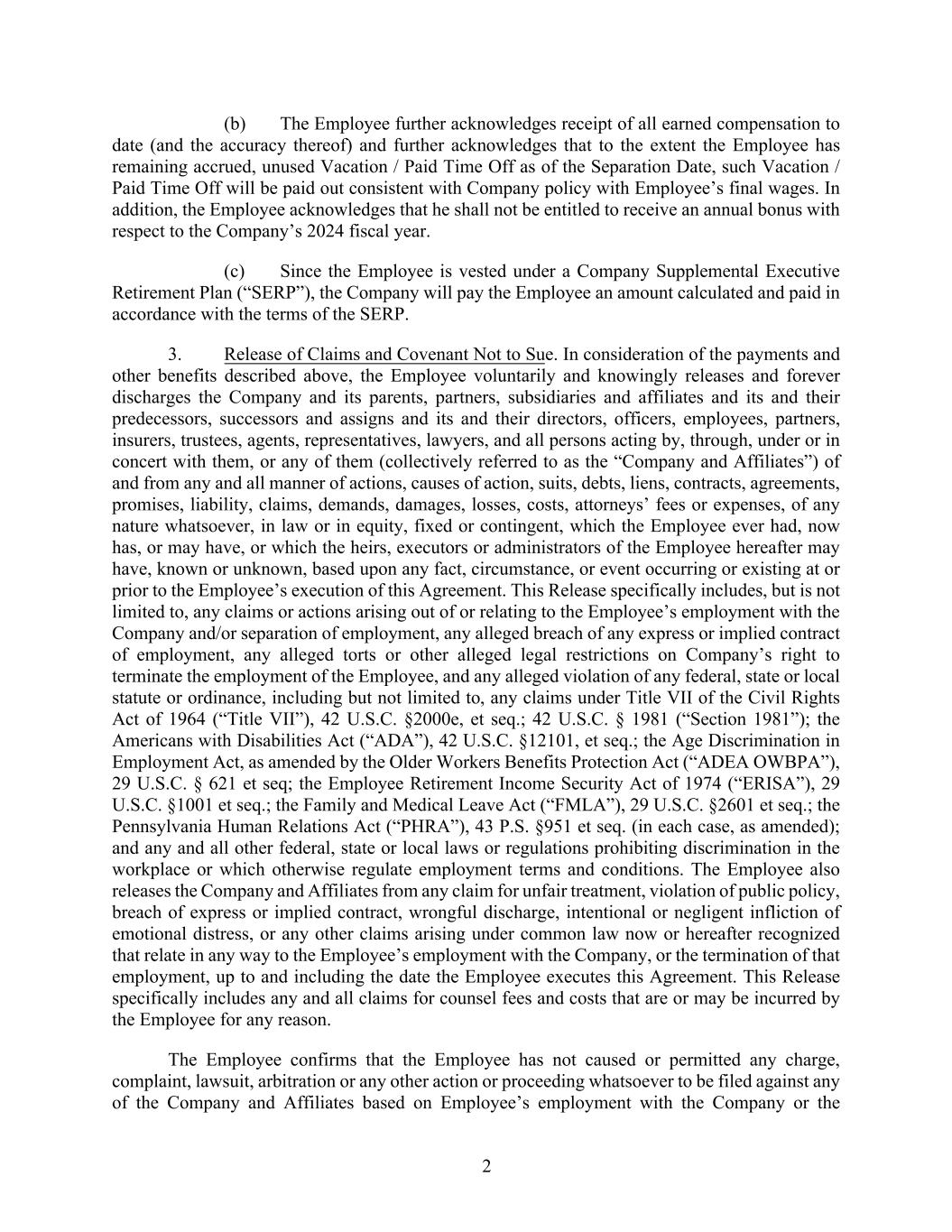 (b) The Employee further acknowledges receipt of all earned compensation to date (and the accuracy thereof) and further acknowledges that to the extent the Employee has remaining accrued, unused Vacation / Paid Time Off as of the Separation Date, such Vacation / Paid Time Off will be paid out consistent with Company policy with Employee’s final wages. In addition, the Employee acknowledges that he shall not be entitled to receive an annual bonus with respect to the Company’s 2024 fiscal year. (c) Since the Employee is vested under a Company Supplemental Executive Retirement Plan (“SERP”), the Company will pay the Employee an amount calculated and paid in accordance with the terms of the SERP. 3. Release of Claims and Covenant Not to Sue. In consideration of the payments and other benefits described above, the Employee voluntarily and knowingly releases and forever discharges the Company and its parents, partners, subsidiaries and affiliates and its and their predecessors, successors and assigns and its and their directors, officers, employees, partners, insurers, trustees, agents, representatives, lawyers, and all persons acting by, through, under or in concert with them, or any of them (collectively referred to as the “Company and Affiliates”) of and from any and all manner of actions, causes of action, suits, debts, liens, contracts, agreements, promises, liability, claims, demands, damages, losses, costs, attorneys’ fees or expenses, of any nature whatsoever, in law or in equity, fixed or contingent, which the Employee ever had, now has, or may have, or which the heirs, executors or administrators of the Employee hereafter may have, known or unknown, based upon any fact, circumstance, or event occurring or existing at or prior to the Employee’s execution of this Agreement. This Release specifically includes, but is not limited to, any claims or actions arising out of or relating to the Employee’s employment with the Company and/or separation of employment, any alleged breach of any express or implied contract of employment, any alleged torts or other alleged legal restrictions on Company’s right to terminate the employment of the Employee, and any alleged violation of any federal, state or local statute or ordinance, including but not limited to, any claims under Title VII of the Civil Rights Act of 1964 (“Title VII”), 42 U.S.C. §2000e, et seq.; 42 U.S.C. § 1981 (“Section 1981”); the Americans with Disabilities Act (“ADA”), 42 U.S.C. §12101, et seq.; the Age Discrimination in Employment Act, as amended by the Older Workers Benefits Protection Act (“ADEA OWBPA”), 29 U.S.C. § 621 et seq; the Employee Retirement Income Security Act of 1974 (“ERISA”), 29 U.S.C. §1001 et seq.; the Family and Medical Leave Act (“FMLA”), 29 U.S.C. §2601 et seq.; the Pennsylvania Human Relations Act (“PHRA”), 43 P.S. §951 et seq. (in each case, as amended); and any and all other federal, state or local laws or regulations prohibiting discrimination in the workplace or which otherwise regulate employment terms and conditions. The Employee also releases the Company and Affiliates from any claim for unfair treatment, violation of public policy, breach of express or implied contract, wrongful discharge, intentional or negligent infliction of emotional distress, or any other claims arising under common law now or hereafter recognized that relate in any way to the Employee’s employment with the Company, or the termination of that employment, up to and including the date the Employee executes this Agreement. This Release specifically includes any and all claims for counsel fees and costs that are or may be incurred by the Employee for any reason. The Employee confirms that the Employee has not caused or permitted any charge, complaint, lawsuit, arbitration or any other action or proceeding whatsoever to be filed against any of the Company and Affiliates based on Employee’s employment with the Company or the 2