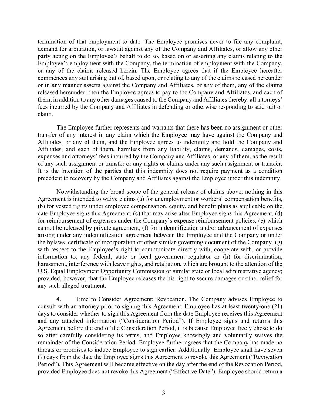 termination of that employment to date. The Employee promises never to file any complaint, demand for arbitration, or lawsuit against any of the Company and Affiliates, or allow any other party acting on the Employee’s behalf to do so, based on or asserting any claims relating to the Employee’s employment with the Company, the termination of employment with the Company, or any of the claims released herein. The Employee agrees that if the Employee hereafter commences any suit arising out of, based upon, or relating to any of the claims released hereunder or in any manner asserts against the Company and Affiliates, or any of them, any of the claims released hereunder, then the Employee agrees to pay to the Company and Affiliates, and each of them, in addition to any other damages caused to the Company and Affiliates thereby, all attorneys’ fees incurred by the Company and Affiliates in defending or otherwise responding to said suit or claim. The Employee further represents and warrants that there has been no assignment or other transfer of any interest in any claim which the Employee may have against the Company and Affiliates, or any of them, and the Employee agrees to indemnify and hold the Company and Affiliates, and each of them, harmless from any liability, claims, demands, damages, costs, expenses and attorneys’ fees incurred by the Company and Affiliates, or any of them, as the result of any such assignment or transfer or any rights or claims under any such assignment or transfer. It is the intention of the parties that this indemnity does not require payment as a condition precedent to recovery by the Company and Affiliates against the Employee under this indemnity. Notwithstanding the broad scope of the general release of claims above, nothing in this Agreement is intended to waive claims (a) for unemployment or workers’ compensation benefits, (b) for vested rights under employee compensation, equity, and benefit plans as applicable on the date Employee signs this Agreement, (c) that may arise after Employee signs this Agreement, (d) for reimbursement of expenses under the Company’s expense reimbursement policies, (e) which cannot be released by private agreement, (f) for indemnification and/or advancement of expenses arising under any indemnification agreement between the Employee and the Company or under the bylaws, certificate of incorporation or other similar governing document of the Company, (g) with respect to the Employee’s right to communicate directly with, cooperate with, or provide information to, any federal, state or local government regulator or (h) for discrimination, harassment, interference with leave rights, and retaliation, which are brought to the attention of the U.S. Equal Employment Opportunity Commission or similar state or local administrative agency; provided, however, that the Employee releases the his right to secure damages or other relief for any such alleged treatment. 4. Time to Consider Agreement; Revocation. The Company advises Employee to consult with an attorney prior to signing this Agreement. Employee has at least twenty-one (21) days to consider whether to sign this Agreement from the date Employee receives this Agreement and any attached information (“Consideration Period”). If Employee signs and returns this Agreement before the end of the Consideration Period, it is because Employee freely chose to do so after carefully considering its terms, and Employee knowingly and voluntarily waives the remainder of the Consideration Period. Employee further agrees that the Company has made no threats or promises to induce Employee to sign earlier. Additionally, Employee shall have seven (7) days from the date the Employee signs this Agreement to revoke this Agreement (“Revocation Period”). This Agreement will become effective on the day after the end of the Revocation Period, provided Employee does not revoke this Agreement (“Effective Date”). Employee should return a 3