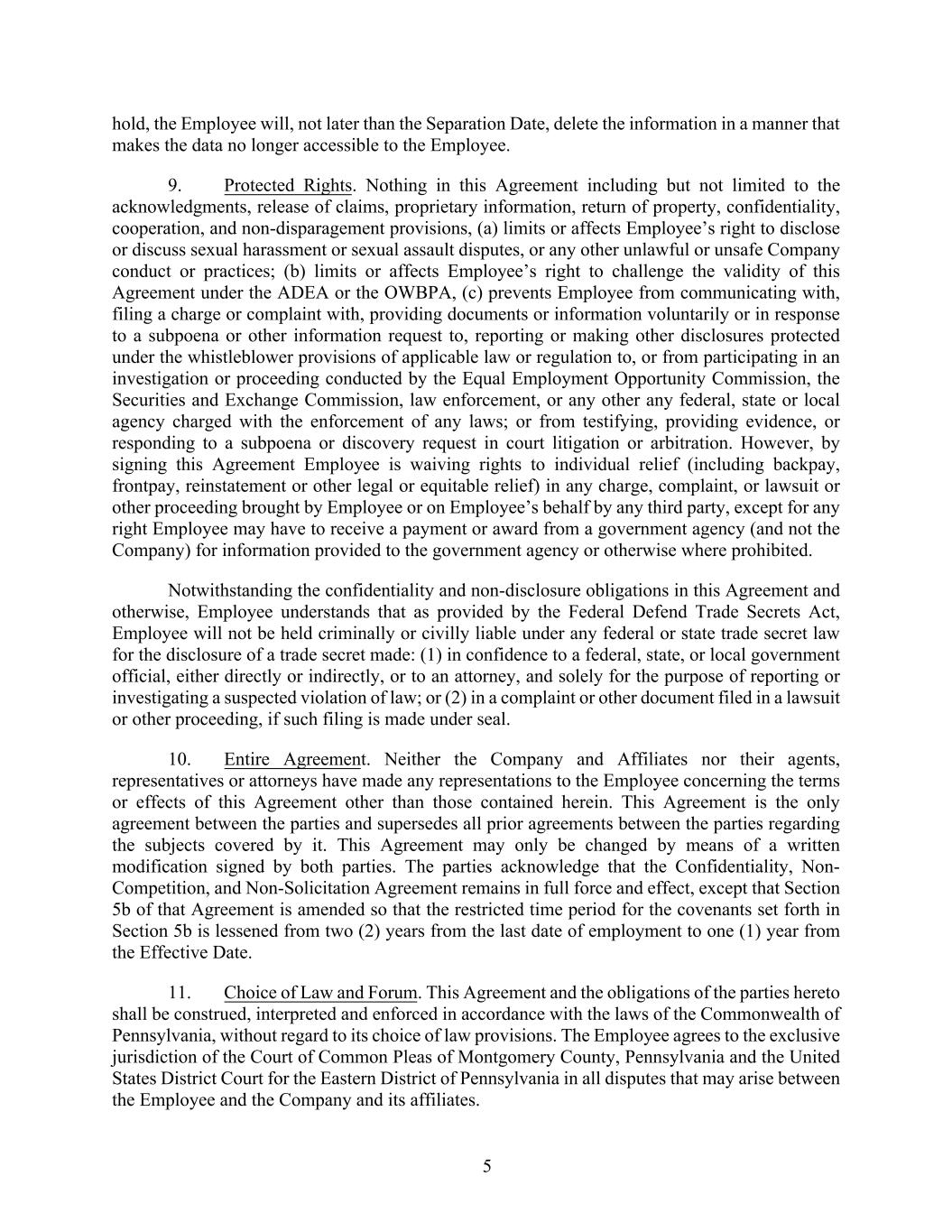hold, the Employee will, not later than the Separation Date, delete the information in a manner that makes the data no longer accessible to the Employee. 9. Protected Rights. Nothing in this Agreement including but not limited to the acknowledgments, release of claims, proprietary information, return of property, confidentiality, cooperation, and non-disparagement provisions, (a) limits or affects Employee’s right to disclose or discuss sexual harassment or sexual assault disputes, or any other unlawful or unsafe Company conduct or practices; (b) limits or affects Employee’s right to challenge the validity of this Agreement under the ADEA or the OWBPA, (c) prevents Employee from communicating with, filing a charge or complaint with, providing documents or information voluntarily or in response to a subpoena or other information request to, reporting or making other disclosures protected under the whistleblower provisions of applicable law or regulation to, or from participating in an investigation or proceeding conducted by the Equal Employment Opportunity Commission, the Securities and Exchange Commission, law enforcement, or any other any federal, state or local agency charged with the enforcement of any laws; or from testifying, providing evidence, or responding to a subpoena or discovery request in court litigation or arbitration. However, by signing this Agreement Employee is waiving rights to individual relief (including backpay, frontpay, reinstatement or other legal or equitable relief) in any charge, complaint, or lawsuit or other proceeding brought by Employee or on Employee’s behalf by any third party, except for any right Employee may have to receive a payment or award from a government agency (and not the Company) for information provided to the government agency or otherwise where prohibited. Notwithstanding the confidentiality and non-disclosure obligations in this Agreement and otherwise, Employee understands that as provided by the Federal Defend Trade Secrets Act, Employee will not be held criminally or civilly liable under any federal or state trade secret law for the disclosure of a trade secret made: (1) in confidence to a federal, state, or local government official, either directly or indirectly, or to an attorney, and solely for the purpose of reporting or investigating a suspected violation of law; or (2) in a complaint or other document filed in a lawsuit or other proceeding, if such filing is made under seal. 10. Entire Agreement. Neither the Company and Affiliates nor their agents, representatives or attorneys have made any representations to the Employee concerning the terms or effects of this Agreement other than those contained herein. This Agreement is the only agreement between the parties and supersedes all prior agreements between the parties regarding the subjects covered by it. This Agreement may only be changed by means of a written modification signed by both parties. The parties acknowledge that the Confidentiality, Non- Competition, and Non-Solicitation Agreement remains in full force and effect, except that Section 5b of that Agreement is amended so that the restricted time period for the covenants set forth in Section 5b is lessened from two (2) years from the last date of employment to one (1) year from the Effective Date. 11. Choice of Law and Forum. This Agreement and the obligations of the parties hereto shall be construed, interpreted and enforced in accordance with the laws of the Commonwealth of Pennsylvania, without regard to its choice of law provisions. The Employee agrees to the exclusive jurisdiction of the Court of Common Pleas of Montgomery County, Pennsylvania and the United States District Court for the Eastern District of Pennsylvania in all disputes that may arise between the Employee and the Company and its affiliates. 5