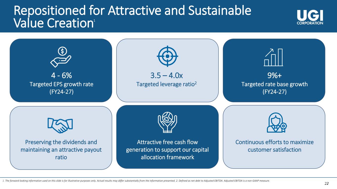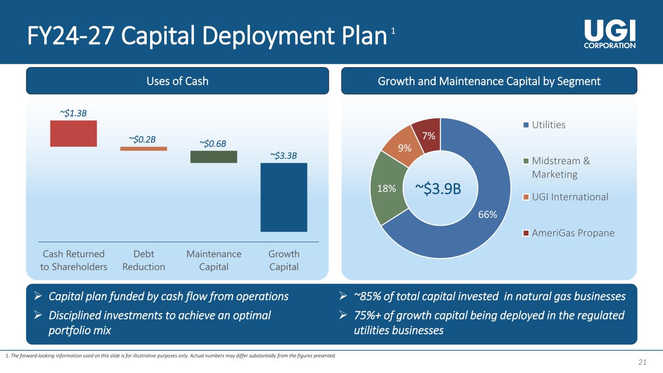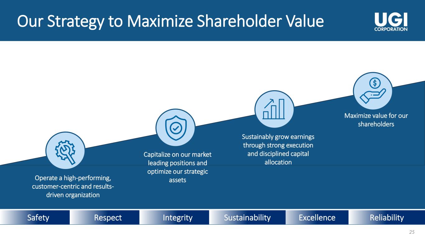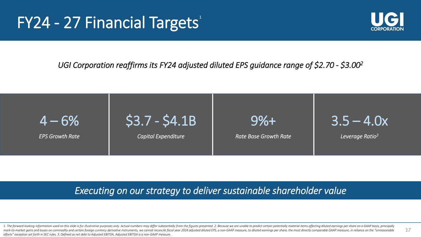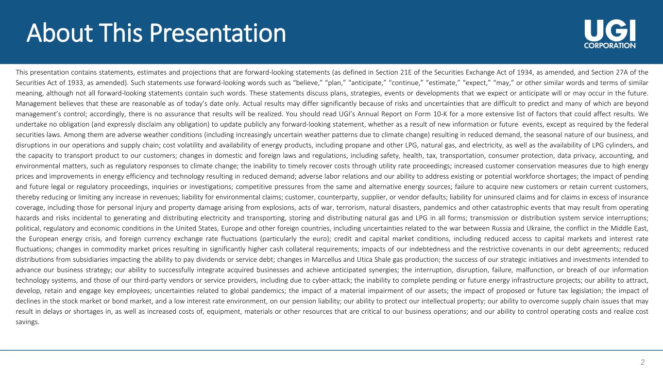 2 2 About This Presentation This presentation contains statements, estimates and projections that are forward-looking statements (as defined in Section 21E of the Securities Exchange Act of 1934, as amended, and Section 27A of the Securities Act of 1933, as amended). Such statements use forward-looking words such as “believe,” “plan,” “anticipate,” “continue,” “estimate,” “expect,” “may,” or other similar words and terms of similar meaning, although not all forward-looking statements contain such words. These statements discuss plans, strategies, events or developments that we expect or anticipate will or may occur in the future. Management believes that these are reasonable as of today’s date only. Actual results may differ significantly because of risks and uncertainties that are difficult to predict and many of which are beyond management’s control; accordingly, there is no assurance that results will be realized. You should read UGI’s Annual Report on Form 10-K for a more extensive list of factors that could affect results. We undertake no obligation (and expressly disclaim any obligation) to update publicly any forward-looking statement, whether as a result of new information or future events, except as required by the federal securities laws. Among them are adverse weather conditions (including increasingly uncertain weather patterns due to climate change) resulting in reduced demand, the seasonal nature of our business, and disruptions in our operations and supply chain; cost volatility and availability of energy products, including propane and other LPG, natural gas, and electricity, as well as the availability of LPG cylinders, and the capacity to transport product to our customers; changes in domestic and foreign laws and regulations, including safety, health, tax, transportation, consumer protection, data privacy, accounting, and environmental matters, such as regulatory responses to climate change; the inability to timely recover costs through utility rate proceedings; increased customer conservation measures due to high energy prices and improvements in energy efficiency and technology resulting in reduced demand; adverse labor relations and our ability to address existing or potential workforce shortages; the impact of pending and future legal or regulatory proceedings, inquiries or investigations; competitive pressures from the same and alternative energy sources; failure to acquire new customers or retain current customers, thereby reducing or limiting any increase in revenues; liability for environmental claims; customer, counterparty, supplier, or vendor defaults; liability for uninsured claims and for claims in excess of insurance coverage, including those for personal injury and property damage arising from explosions, acts of war, terrorism, natural disasters, pandemics and other catastrophic events that may result from operating hazards and risks incidental to generating and distributing electricity and transporting, storing and distributing natural gas and LPG in all forms; transmission or distribution system service interruptions; political, regulatory and economic conditions in the United States, Europe and other foreign countries, including uncertainties related to the war between Russia and Ukraine, the conflict in the Middle East, the European energy crisis, and foreign currency exchange rate fluctuations (particularly the euro); credit and capital market conditions, including reduced access to capital markets and interest rate fluctuations; changes in commodity market prices resulting in significantly higher cash collateral requirements; impacts of our indebtedness and the restrictive covenants in our debt agreements; reduced distributions from subsidiaries impacting the ability to pay dividends or service debt; changes in Marcellus and Utica Shale gas production; the success of our strategic initiatives and investments intended to advance our business strategy; our ability to successfully integrate acquired businesses and achieve anticipated synergies; the interruption, disruption, failure, malfunction, or breach of our information technology systems, and those of our third-party vendors or service providers, including due to cyber-attack; the inability to complete pending or future energy infrastructure projects; our ability to attract, develop, retain and engage key employees; uncertainties related to global pandemics; the impact of a material impairment of our assets; the impact of proposed or future tax legislation; the impact of declines in the stock market or bond market, and a low interest rate environment, on our pension liability; our ability to protect our intellectual property; our ability to overcome supply chain issues that may result in delays or shortages in, as well as increased costs of, equipment, materials or other resources that are critical to our business operations; and our ability to control operating costs and realize cost savings.