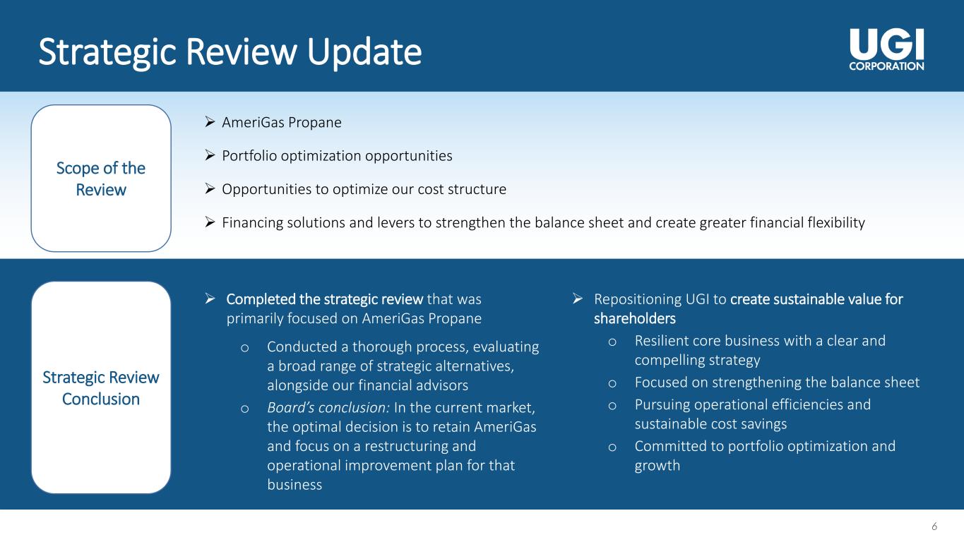 6 6 Strategic Review Update 6 ➢ AmeriGas Propane ➢ Portfolio optimization opportunities ➢ Opportunities to optimize our cost structure ➢ Financing solutions and levers to strengthen the balance sheet and create greater financial flexibility Strategic Review Conclusion ➢ Completed the strategic review that was primarily focused on AmeriGas Propane o Conducted a thorough process, evaluating a broad range of strategic alternatives, alongside our financial advisors o Board’s conclusion: In the current market, the optimal decision is to retain AmeriGas and focus on a restructuring and operational improvement plan for that business ➢ Repositioning UGI to create sustainable value for shareholders o Resilient core business with a clear and compelling strategy o Focused on strengthening the balance sheet o Pursuing operational efficiencies and sustainable cost savings o Committed to portfolio optimization and growth Scope of the Review
