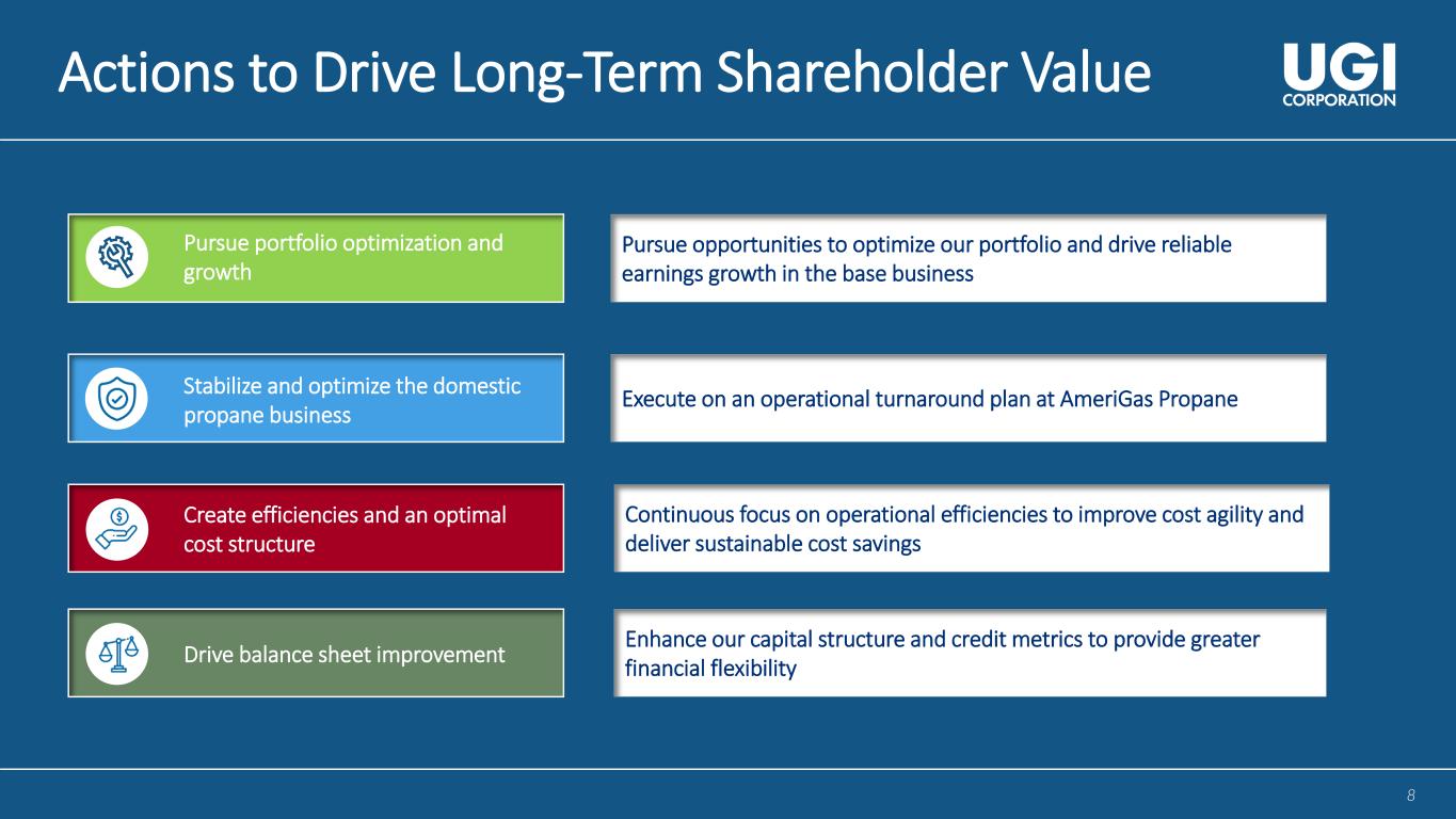 7 7 66% 34% 75%+ 25% Our Businesses • Leading regulated utilities in constructive regulatory environments • Strong rate base growth and attractive return on equity • Weather normalization riders to promote earnings reliability • Attractive capital investment runway with minimal regulatory lag 7 Regulated Utilities 1 • Largest retail LPG distributor in the US1 with broad geographic footprint serving all 50 states • Significant supply and transportation network across the nation • Consistent free cash flow generation AmeriGas Propane Growth YTD FY24 Adj. Diluted EPS Natural Gas Targeted Adj. Diluted EPS Midstream & Marketing • Full suite of midstream services • Scalable infrastructure to meet increasing demand • Significant fee-based income promotes earnings stability UGI International • Leading market positions • Strategically located supply assets • Strong track record of margin stability and free cash flow generation Global LPG Cash Generation 1. Based on the volume of propane gallons distributed annually.
