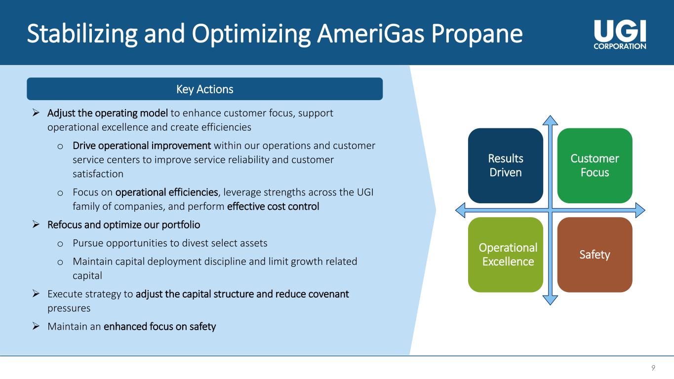 8 8 Actions to Drive Long-Term Shareholder Value Pursue opportunities to optimize our portfolio and drive reliable earnings growth in the base business Continuous focus on operational efficiencies to improve cost agility and deliver sustainable cost savings Execute on an operational turnaround plan at AmeriGas Propane Enhance our capital structure and credit metrics to provide greater financial flexibility Pursue portfolio optimization and growth Create efficiencies and an optimal cost structure Drive balance sheet improvement Stabilize and optimize the domestic propane business