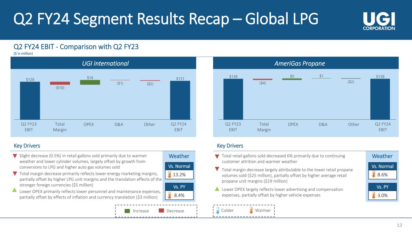 13 13 Weather• Slight decrease (0.5%) in retail gallons sold primarily due to warmer weather and lower cylinder volumes, largely offset by growth from conversions to LPG and higher auto gas volumes sold • Total margin decrease primarily reflects lower energy marketing margins, partially offset by higher LPG unit margins and the translation effects of the stronger foreign currencies ($5 million) • Lower OPEX primarily reflects lower personnel and maintenance expenses, partially offset by effects of inflation and currency translation ($3 million) Q2 FY24 Segment Results Recap – Global LPG UGI International Key Drivers 13.2% 8.4% Vs. Normal Vs. PY Increase Decrease WarmerColder Weather• Total retail gallons sold decreased 6% primarily due to continuing customer attrition and warmer weather • Total margin decrease largely attributable to the lower retail propane volumes sold ($25 million), partially offset by higher average retail propane unit margins ($19 million) • Lower OPEX largely reflects lower advertising and compensation expenses, partially offset by higher vehicle expenses AmeriGas Propane Key Drivers 8.6% 3.0% Vs. Normal Vs. PY Q2 FY24 EBIT - Comparison with Q2 FY23 ($ in million) Q2 FY23 EBIT Q2 FY24 EBIT Total Margin OPEX D&A OtherQ2 FY23 EBIT Q2 FY24 EBIT Total Margin OPEX D&A Other
