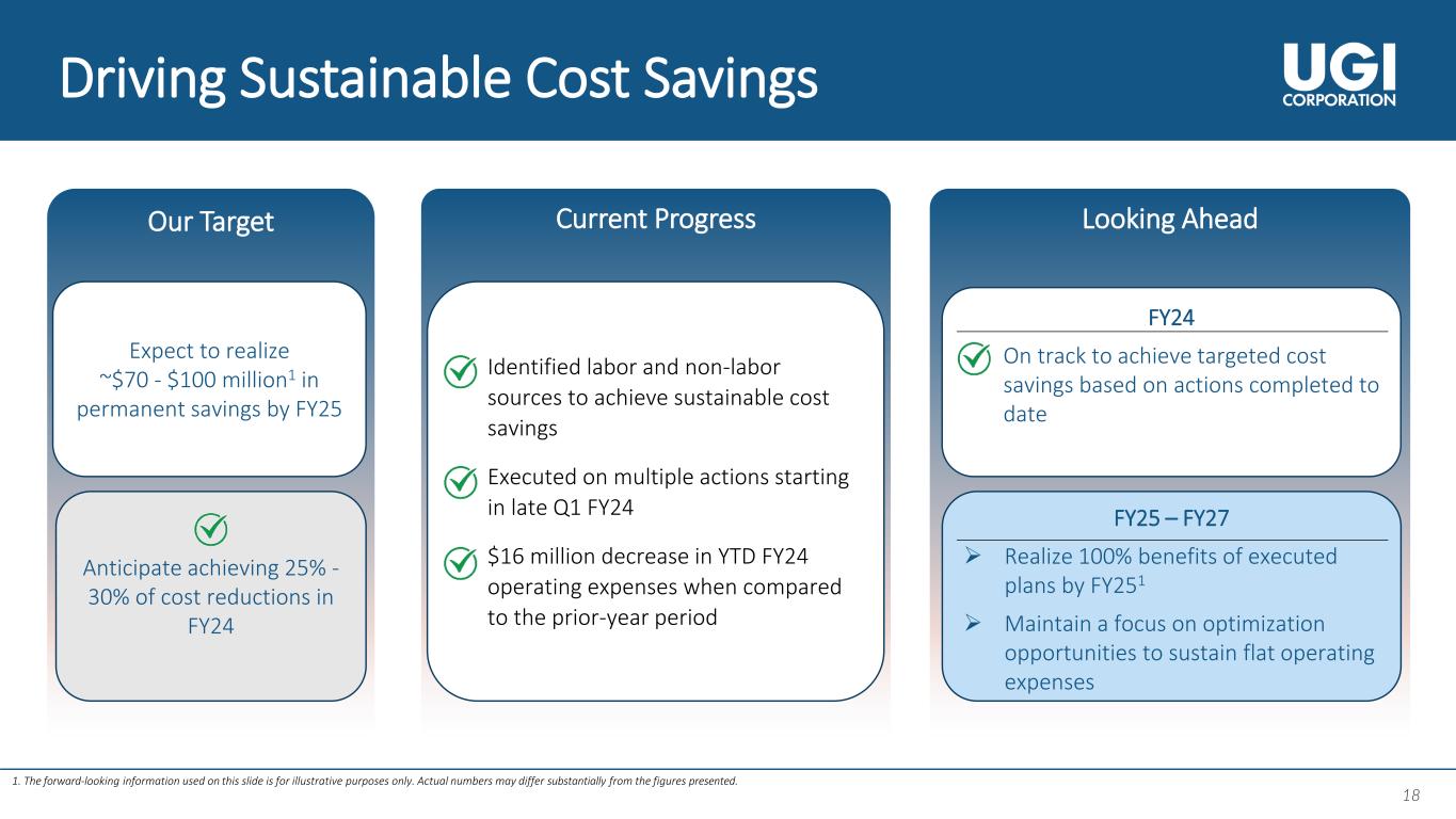 17 17 FY24 - 27 Financial Targets 17 1. The forward-looking information used on this slide is for illustrative purposes only. Actual numbers may differ substantially from the figures presented. 2. Because we are unable to predict certain potentially material items affecting diluted earnings per share on a GAAP basis, principally mark-to-market gains and losses on commodity and certain foreign currency derivative instruments, we cannot reconcile fiscal year 2024 adjusted diluted EPS, a non-GAAP measure, to diluted earnings per share, the most directly comparable GAAP measure, in reliance on the “unreasonable efforts” exception set forth in SEC rules. 3. Defined as net debt to Adjusted EBITDA. Adjusted EBITDA is a non-GAAP measure. Executing on our strategy to deliver sustainable shareholder value UGI Corporation reaffirms its FY24 adjusted diluted EPS guidance range of $2.70 - $3.002 4 – 6% $3.7 - $4.1B 9%+ 3.5 – 4.0x EPS Growth Rate Capital Expenditure Rate Base Growth Rate Leverage Ratio3 1