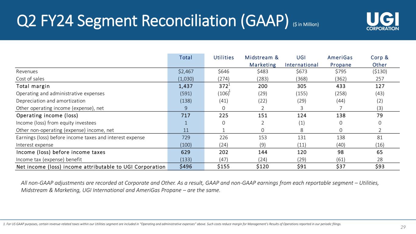 29 29 Q2 FY24 Segment Reconciliation (GAAP) ($ in Million) 1. For US GAAP purposes, certain revenue-related taxes within our Utilities segment are included in “Operating and administrative expenses” above. Such costs reduce margin for Management’s Results of Operations reported in our periodic filings. 1 1 All non-GAAP adjustments are recorded at Corporate and Other. As a result, GAAP and non-GAAP earnings from each reportable segment – Utilities, Midstream & Marketing, UGI International and AmeriGas Propane – are the same. Total Uti l i ties Midstream & Marketing UGI International AmeriGas Propane Corp & Other Revenues $2,467 $646 $483 $673 $795 ($130) Cost of sales (1,030) (274) (283) (368) (362) 257 Total margin 1,437 372 200 305 433 127 Operating and administrative expenses (591) (106) (29) (155) (258) (43) Depreciation and amortization (138) (41) (22) (29) (44) (2) Other operating income (expense), net 9 0 2 3 7 (3) Operating income (loss) 717 225 151 124 138 79 Income (loss) from equity investees 1 0 2 (1) 0 0 Other non-operating (expense) income, net 11 1 0 8 0 2 Earnings (loss) before income taxes and interest expense 729 226 153 131 138 81 Interest expense (100) (24) (9) (11) (40) (16) Income (loss) before income taxes 629 202 144 120 98 65 Income tax (expense) benefit (133) (47) (24) (29) (61) 28 Net income (loss) income attr ibutable to UGI Corporation $496 $155 $120 $91 $37 $93