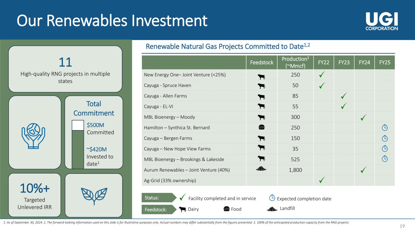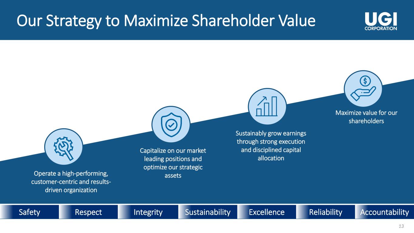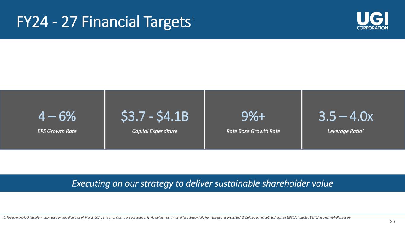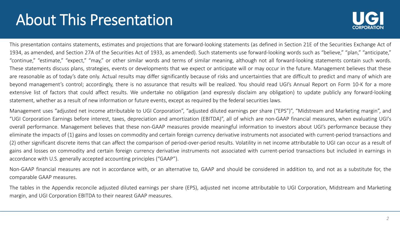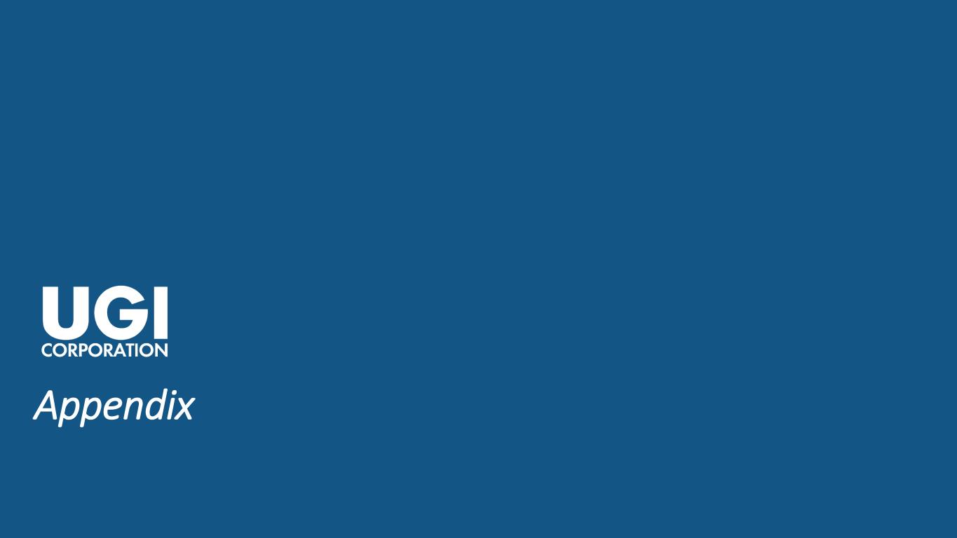 2 2 About This Presentation This presentation contains statements, estimates and projections that are forward-looking statements (as defined in Section 21E of the Securities Exchange Act of 1934, as amended, and Section 27A of the Securities Act of 1933, as amended). Such statements use forward-looking words such as “believe,” “plan,” “anticipate,” “continue,” “estimate,” “expect,” “may,” or other similar words and terms of similar meaning, although not all forward-looking statements contain such words. These statements discuss plans, strategies, events or developments that we expect or anticipate will or may occur in the future. Management believes that these are reasonable as of today’s date only. Actual results may differ significantly because of risks and uncertainties that are difficult to predict and many of which are beyond management’s control; accordingly, there is no assurance that results will be realized. You should read UGI’s Annual Report on Form 10-K for a more extensive list of factors that could affect results. We undertake no obligation (and expressly disclaim any obligation) to update publicly any forward-looking statement, whether as a result of new information or future events, except as required by the federal securities laws. Management uses “adjusted net income attributable to UGI Corporation”, “adjusted diluted earnings per share (“EPS”)”, “Midstream and Marketing margin”, and “UGI Corporation Earnings before interest, taxes, depreciation and amortization (EBITDA)”, all of which are non-GAAP financial measures, when evaluating UGI's overall performance. Management believes that these non-GAAP measures provide meaningful information to investors about UGI’s performance because they eliminate the impacts of (1) gains and losses on commodity and certain foreign currency derivative instruments not associated with current-period transactions and (2) other significant discrete items that can affect the comparison of period-over-period results. Volatility in net income attributable to UGI can occur as a result of gains and losses on commodity and certain foreign currency derivative instruments not associated with current-period transactions but included in earnings in accordance with U.S. generally accepted accounting principles (“GAAP”). Non-GAAP financial measures are not in accordance with, or an alternative to, GAAP and should be considered in addition to, and not as a substitute for, the comparable GAAP measures. The tables in the Appendix reconcile adjusted diluted earnings per share (EPS), adjusted net income attributable to UGI Corporation, Midstream and Marketing margin, and UGI Corporation EBITDA to their nearest GAAP measures.