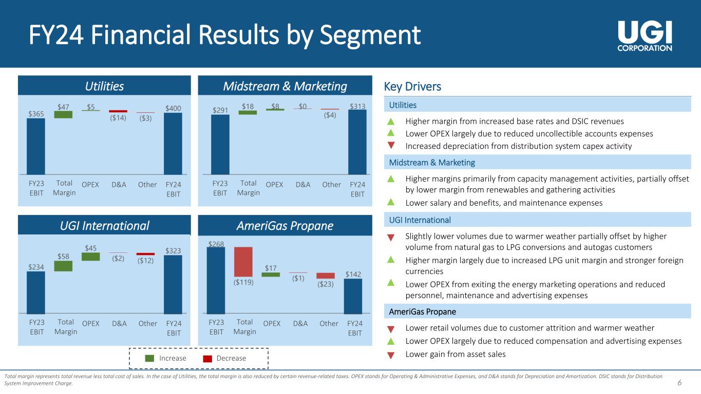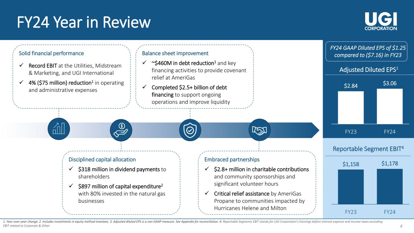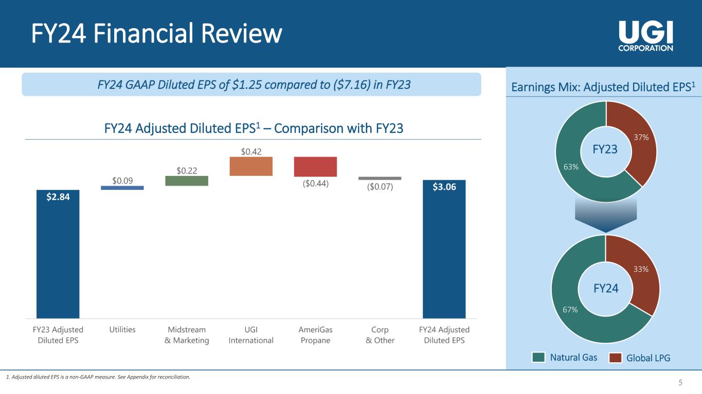 4 4 4 1. Year-over-year change. 2. Includes investments in equity method investees. 3. Adjusted diluted EPS is a non-GAAP measure. See Appendix for reconciliation. 4. Reportable Segments EBIT stands for UGI Corporation’s Earnings before interest expense and income taxes excluding EBIT related to Corporate & Other. FY24 Year in Review Adjusted Diluted EPS3 $2.84 $3.06 FY23 FY24 Reportable Segment EBIT4 $1,158 $1,178 FY23 FY24 FY24 GAAP Diluted EPS of $1.25 compared to ($7.16) in FY23Solid financial performance ✓ Record EBIT at the Utilities, Midstream & Marketing, and UGI International ✓ 4% ($75 million) reduction1 in operating and administrative expenses Disciplined capital allocation ✓ $318 million in dividend payments to shareholders ✓ $897 million of capital expenditure2 with 80% invested in the natural gas businesses Balance sheet improvement ✓ ~$460M in debt reduction1 and key financing activities to provide covenant relief at AmeriGas ✓ Completed $2.5+ billion of debt financing to support ongoing operations and improve liquidity Embraced partnerships ✓ $2.8+ million in charitable contributions and community sponsorships and significant volunteer hours ✓ Critical relief assistance by AmeriGas Propane to communities impacted by Hurricanes Helene and Milton