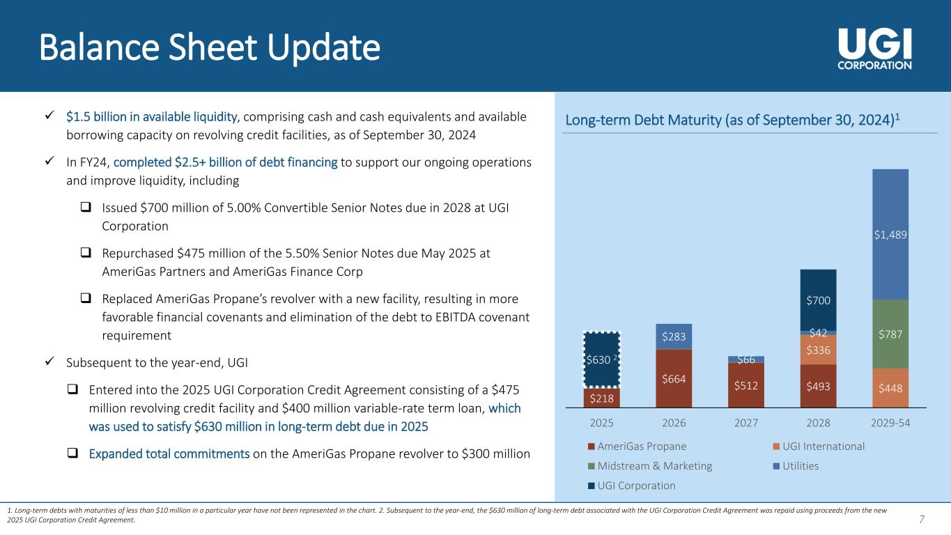 6 6 Utilities • Higher margin from increased base rates and DSIC revenues • Lower OPEX largely due to reduced uncollectible accounts expenses • Increased depreciation from distribution system capex activity FY24 Financial Results by Segment Utilities FY23 EBIT FY24 EBIT Total Margin OPEX D&A Other Midstream & Marketing UGI International AmeriGas Propane Increase Decrease Key Drivers Midstream & Marketing • Higher margins primarily from capacity management activities, partially offset by lower margin from renewables and gathering activities • Lower salary and benefits, and maintenance expenses UGI International • Slightly lower volumes due to warmer weather partially offset by higher volume from natural gas to LPG conversions and autogas customers • Higher margin largely due to increased LPG unit margin and stronger foreign currencies • Lower OPEX from exiting the energy marketing operations and reduced personnel, maintenance and advertising expenses AmeriGas Propane • Lower retail volumes due to customer attrition and warmer weather • Lower OPEX largely due to reduced compensation and advertising expenses • Lower gain from asset sales FY23 EBIT FY24 EBIT Total Margin OPEX D&A Other FY23 EBIT FY24 EBIT Total Margin OPEX D&A OtherFY23 EBIT FY24 EBIT Total Margin OPEX D&A Other Total margin represents total revenue less total cost of sales. In the case of Utilities, the total margin is also reduced by certain revenue-related taxes. OPEX stands for Operating & Administrative Expenses, and D&A stands for Depreciation and Amortization. DSIC stands for Distribution System Improvement Charge.