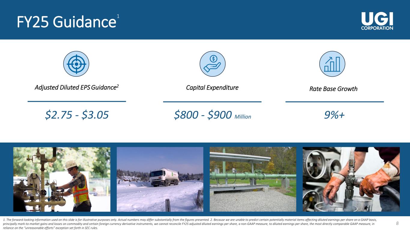 7 7 Balance Sheet Update Long-term Debt Maturity (as of September 30, 2024)1 1. Long-term debts with maturities of less than $10 million in a particular year have not been represented in the chart. 2. Subsequent to the year-end, the $630 million of long-term debt associated with the UGI Corporation Credit Agreement was repaid using proceeds from the new 2025 UGI Corporation Credit Agreement. ✓ $1.5 billion in available liquidity, comprising cash and cash equivalents and available borrowing capacity on revolving credit facilities, as of September 30, 2024 ✓ In FY24, completed $2.5+ billion of debt financing to support our ongoing operations and improve liquidity, including ❑ Issued $700 million of 5.00% Convertible Senior Notes due in 2028 at UGI Corporation ❑ Repurchased $475 million of the 5.50% Senior Notes due May 2025 at AmeriGas Partners and AmeriGas Finance Corp ❑ Replaced AmeriGas Propane’s revolver with a new facility, resulting in more favorable financial covenants and elimination of the debt to EBITDA covenant requirement ✓ Subsequent to the year-end, UGI ❑ Entered into the 2025 UGI Corporation Credit Agreement consisting of a $475 million revolving credit facility and $400 million variable-rate term loan, which was used to satisfy $630 million in long-term debt due in 2025 ❑ Expanded total commitments on the AmeriGas Propane revolver to $300 million $218 $664 $512 $493 $336 $448 $787 $283 $66 $42 $1,489 $630 2 $700 2025 2026 2027 2028 2029-54 AmeriGas Propane UGI International Midstream & Marketing Utilities UGI Corporation