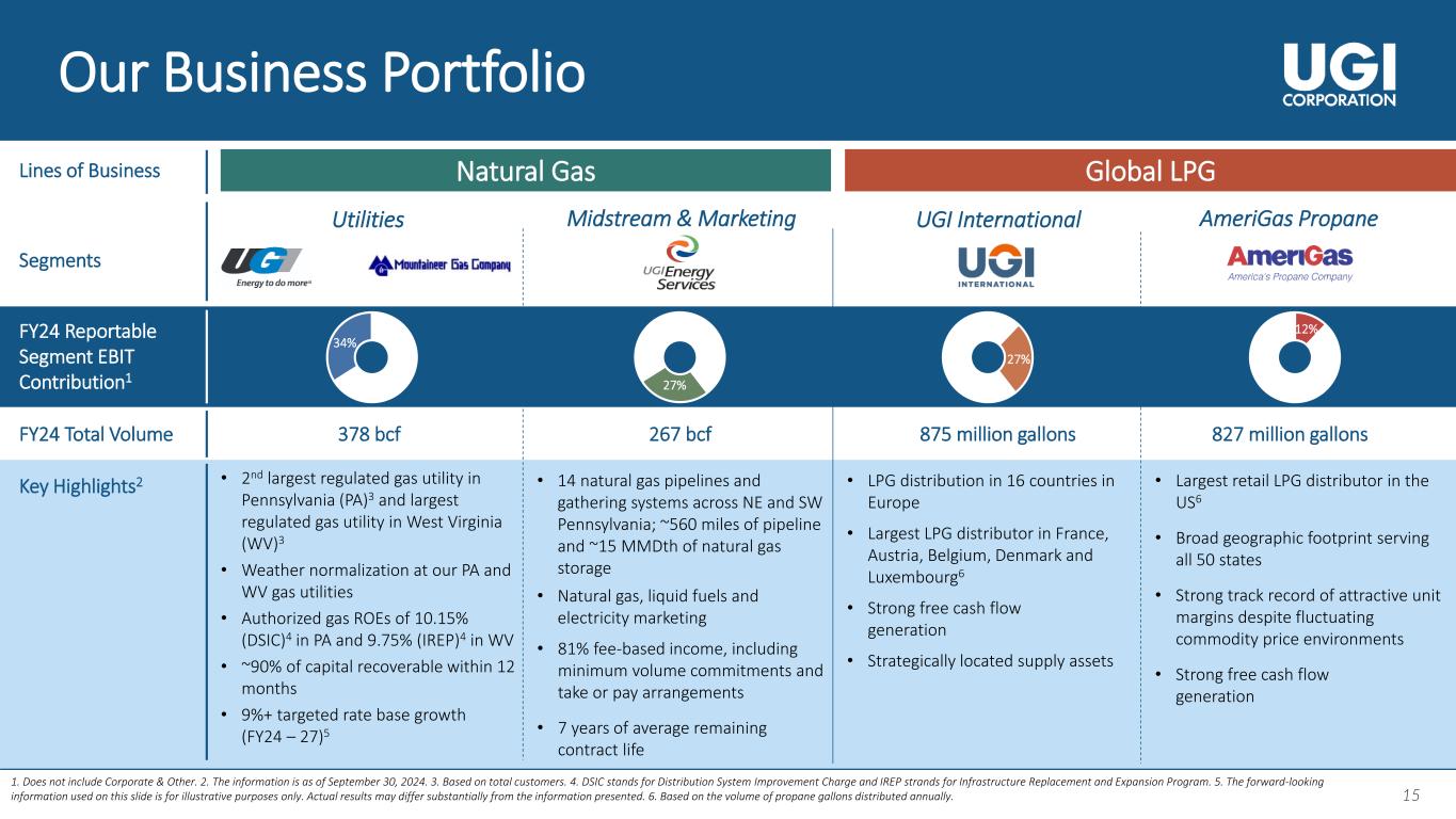 14 14 Shareholder Value Proposition 75%+ Targeted Earnings from the Natural Gas Businesses1 4 - 6% Targeted Long- Term EPS Growth Rate1 9%+ Targeted Rate Base Growth1 International energy distributor with an attractive business mix and leading position in key markets Building a culture of continuous improvement to drive cost competitiveness and sustainable cost savings Focused on prudent capital allocation while investing in growth and maintaining a strong balance sheet and financial flexibility Committed to returning cash to shareholders through dividends Relentless focus on the customers’ experience 1. The forward-looking information used on this slide is for illustrative purposes only. Actual numbers may differ substantially from the figures presented.