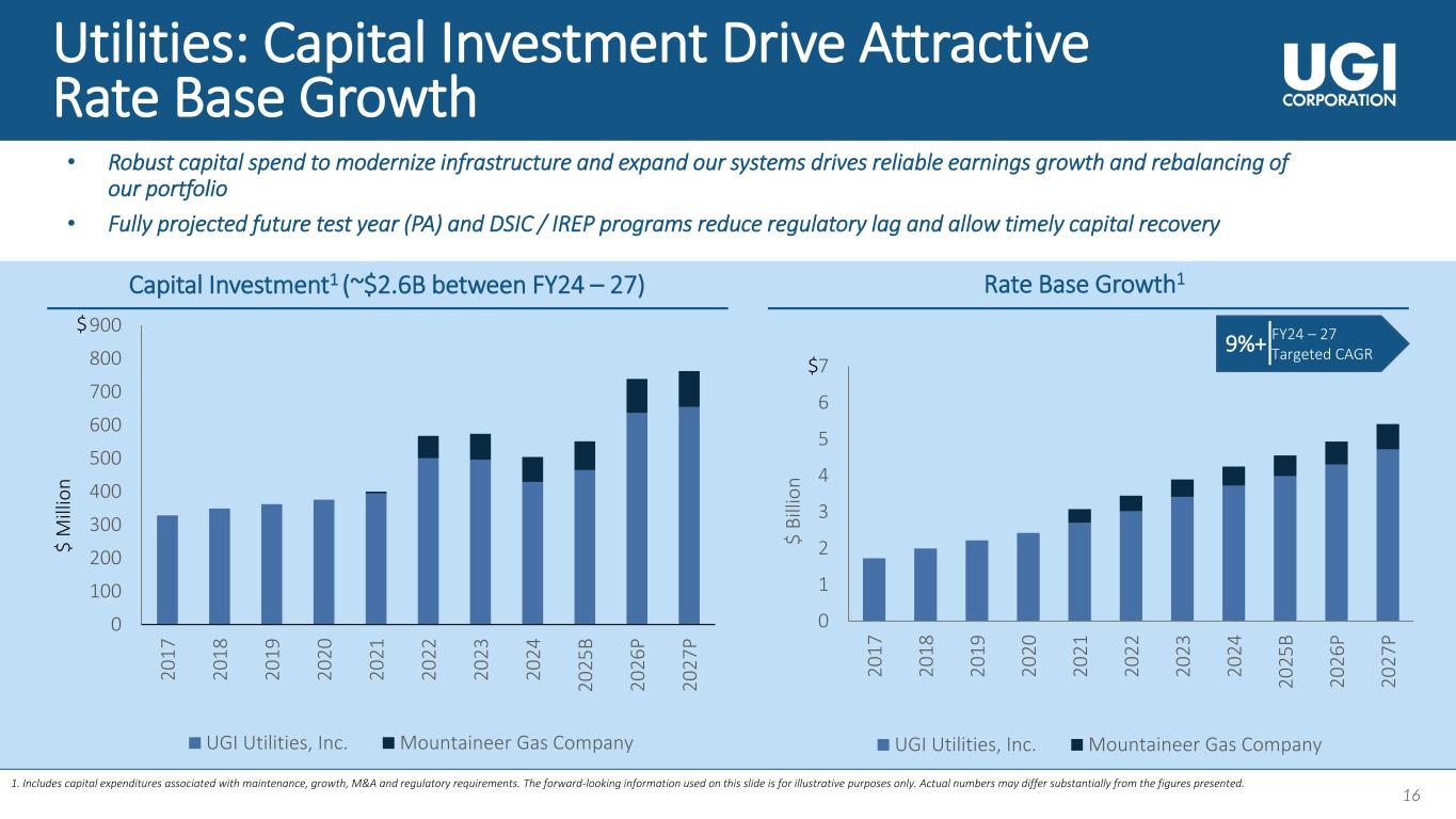 15 15 Our Business Portfolio 1. Does not include Corporate & Other. 2. The information is as of September 30, 2024. 3. Based on total customers. 4. DSIC stands for Distribution System Improvement Charge and IREP strands for Infrastructure Replacement and Expansion Program. 5. The forward-looking information used on this slide is for illustrative purposes only. Actual results may differ substantially from the information presented. 6. Based on the volume of propane gallons distributed annually. Lines of Business Segments FY24 Total Volume FY24 Reportable Segment EBIT Contribution1 • 2nd largest regulated gas utility in Pennsylvania (PA)3 and largest regulated gas utility in West Virginia (WV)3 • Weather normalization at our PA and WV gas utilities • Authorized gas ROEs of 10.15% (DSIC)4 in PA and 9.75% (IREP)4 in WV • ~90% of capital recoverable within 12 months • 9%+ targeted rate base growth (FY24 – 27)5 • 14 natural gas pipelines and gathering systems across NE and SW Pennsylvania; ~560 miles of pipeline and ~15 MMDth of natural gas storage • Natural gas, liquid fuels and electricity marketing • 81% fee-based income, including minimum volume commitments and take or pay arrangements • 7 years of average remaining contract life • Largest retail LPG distributor in the US6 • Broad geographic footprint serving all 50 states • Strong track record of attractive unit margins despite fluctuating commodity price environments • Strong free cash flow generation • LPG distribution in 16 countries in Europe • Largest LPG distributor in France, Austria, Belgium, Denmark and Luxembourg6 • Strong free cash flow generation • Strategically located supply assets Natural Gas Global LPG Utilities Midstream & Marketing UGI International AmeriGas Propane 34% Key Highlights2 378 bcf 267 bcf 875 million gallons 827 million gallons 27% 27% 12%