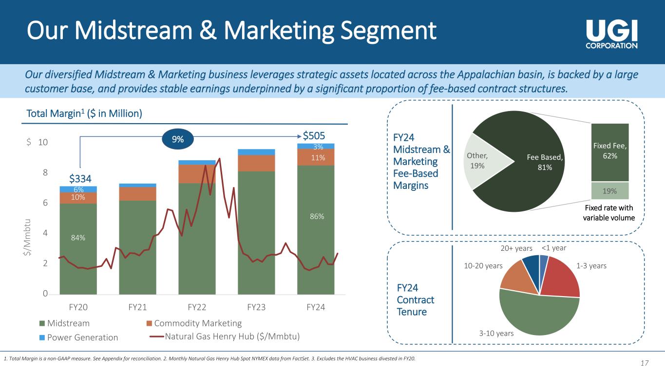 16 0 100 200 300 400 500 600 700 800 900 2 0 1 7 2 0 1 8 2 0 1 9 2 0 2 0 2 0 2 1 2 0 2 2 2 0 2 3 2 0 2 4 2 0 2 5 B 2 0 2 6 P 2 0 2 7 P UGI Utilities, Inc. Mountaineer Gas Company Utilities: Capital Investment Drive Attractive Rate Base Growth Rate Base Growth1 1. Includes capital expenditures associated with maintenance, growth, M&A and regulatory requirements. The forward-looking information used on this slide is for illustrative purposes only. Actual numbers may differ substantially from the figures presented. • Robust capital spend to modernize infrastructure and expand our systems drives reliable earnings growth and rebalancing of our portfolio • Fully projected future test year (PA) and DSIC / IREP programs reduce regulatory lag and allow timely capital recovery FY24 – 27 Targeted CAGR $ Capital Investment1 (~$2.6B between FY24 – 27) $ $ M ill io n 0 1 2 3 4 5 6 7 2 0 1 7 2 0 1 8 2 0 1 9 2 0 2 0 2 0 2 1 2 0 2 2 2 0 2 3 2 0 2 4 2 0 2 5 B 2 0 2 6 P 2 0 2 7 P $ B ill io n UGI Utilities, Inc. Mountaineer Gas Company 9%+