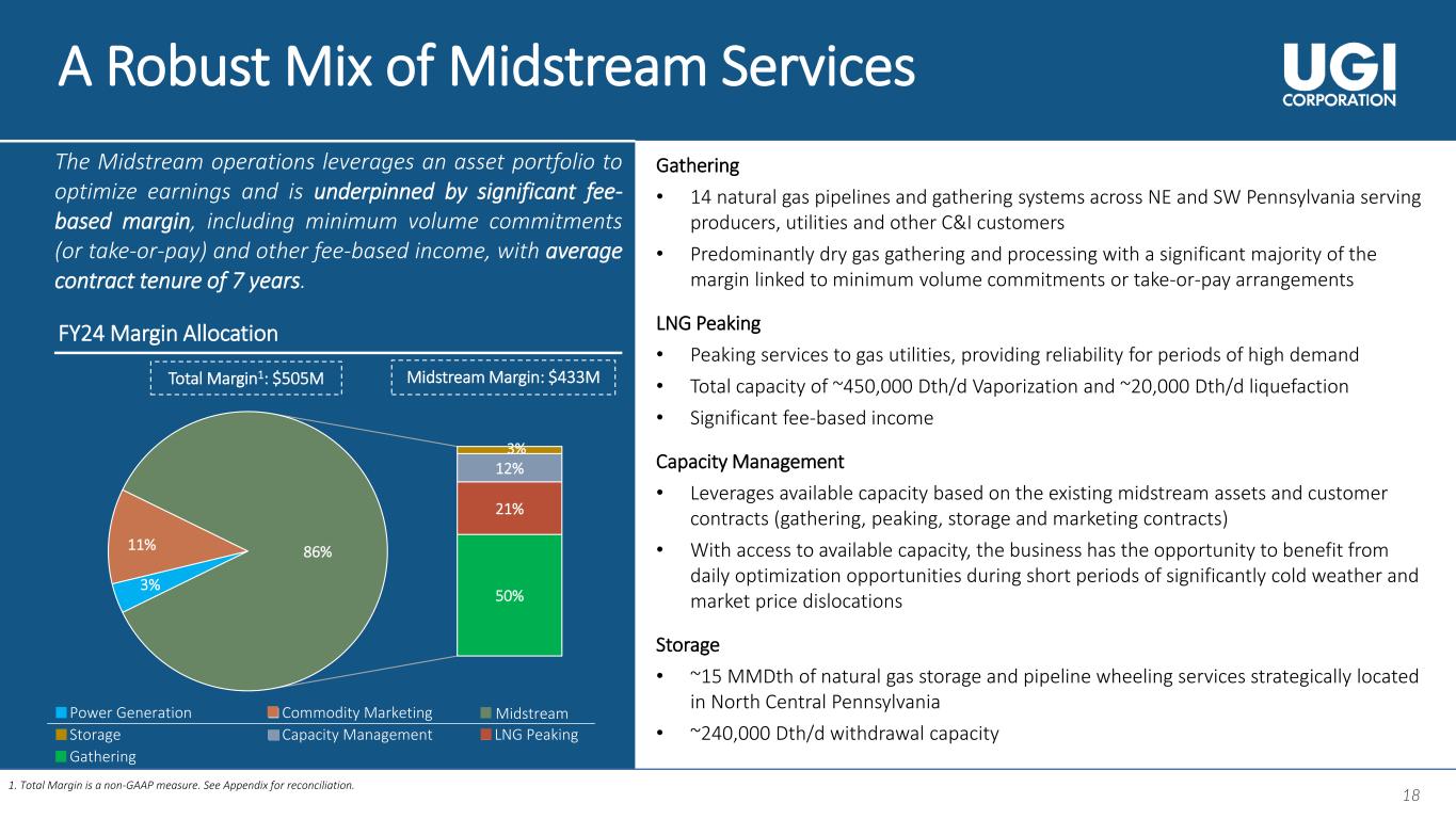 17 Other, 19% Fixed Fee, 62% 19% Fee Based, 81% FY20 FY21 FY22 FY23 FY24 Midstream Commodity Marketing Power Generation 0 2 4 6 8 10 Natural Gas Henry Hub ($/Mmbtu) Our Midstream & Marketing Segment 1. Total Margin is a non-GAAP measure. See Appendix for reconciliation. 2. Monthly Natural Gas Henry Hub Spot NYMEX data from FactSet. 3. Excludes the HVAC business divested in FY20. $334 $505 Total Margin1 ($ in Million) 84% 10% 6% $ $ /M m b tu Our diversified Midstream & Marketing business leverages strategic assets located across the Appalachian basin, is backed by a large customer base, and provides stable earnings underpinned by a significant proportion of fee-based contract structures. Fixed rate with variable volume FY24 Contract Tenure FY24 Midstream & Marketing Fee-Based Margins 9% <1 year 1-3 years 3-10 years 10-20 years 20+ years 86% 11% 3%