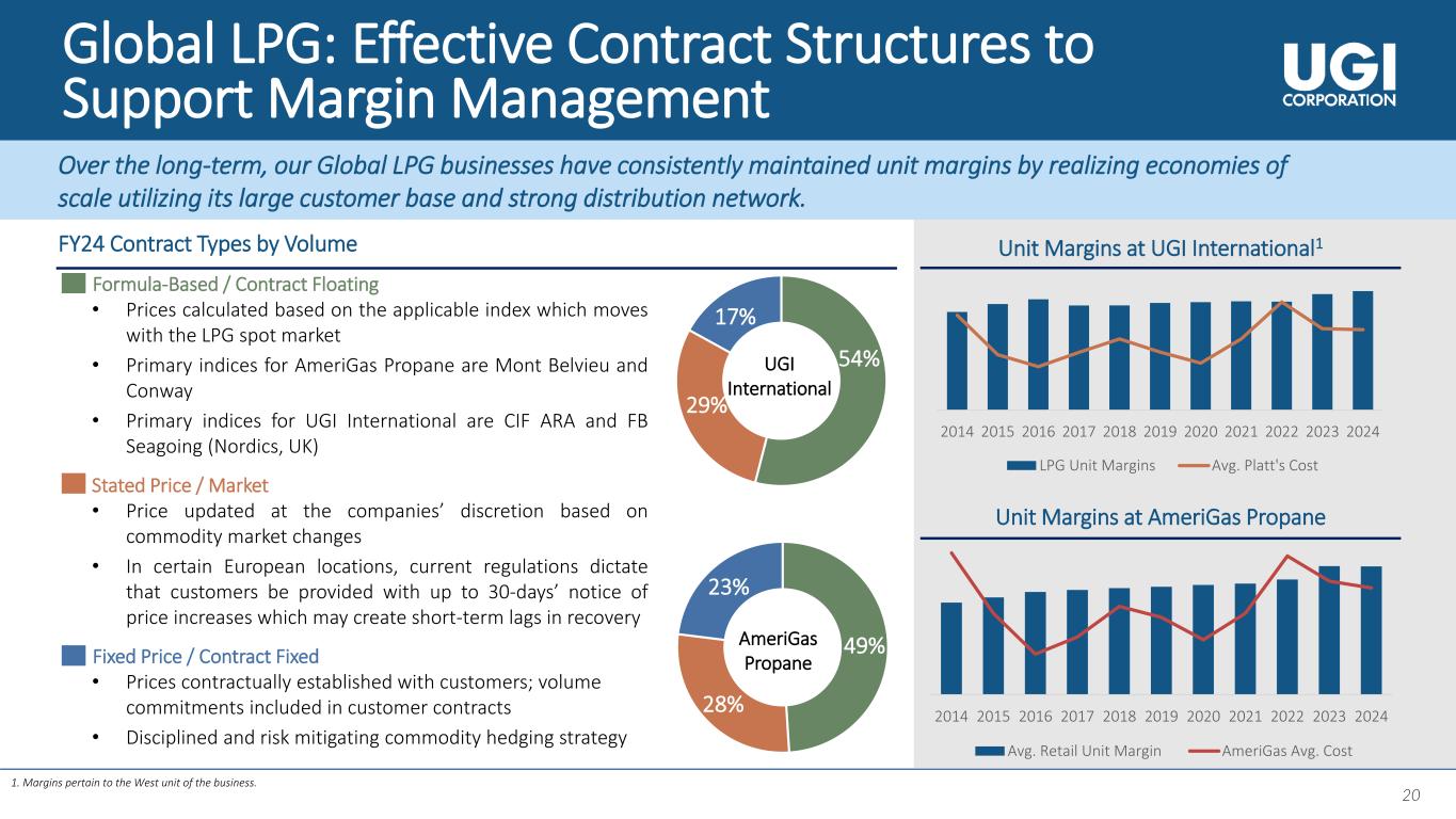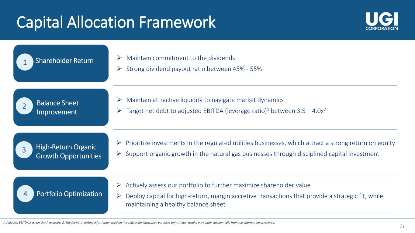 20 Global LPG: Effective Contract Structures to Support Margin Management Unit Margins at AmeriGas Propane Over the long-term, our Global LPG businesses have consistently maintained unit margins by realizing economies of scale utilizing its large customer base and strong distribution network. 49% 28% 23% Formula-Based / Contract Floating • Prices calculated based on the applicable index which moves with the LPG spot market • Primary indices for AmeriGas Propane are Mont Belvieu and Conway • Primary indices for UGI International are CIF ARA and FB Seagoing (Nordics, UK) Stated Price / Market • Price updated at the companies’ discretion based on commodity market changes • In certain European locations, current regulations dictate that customers be provided with up to 30-days’ notice of price increases which may create short-term lags in recovery Fixed Price / Contract Fixed • Prices contractually established with customers; volume commitments included in customer contracts • Disciplined and risk mitigating commodity hedging strategy FY24 Contract Types by Volume Unit Margins at UGI International1 AmeriGas Propane UGI International 1. Margins pertain to the West unit of the business. 2014 2015 2016 2017 2018 2019 2020 2021 2022 2023 2024 Avg. Retail Unit Margin AmeriGas Avg. Cost 54% 29% 17% 2014 2015 2016 2017 2018 2019 2020 2021 2022 2023 2024 LPG Unit Margins Avg. Platt's Cost