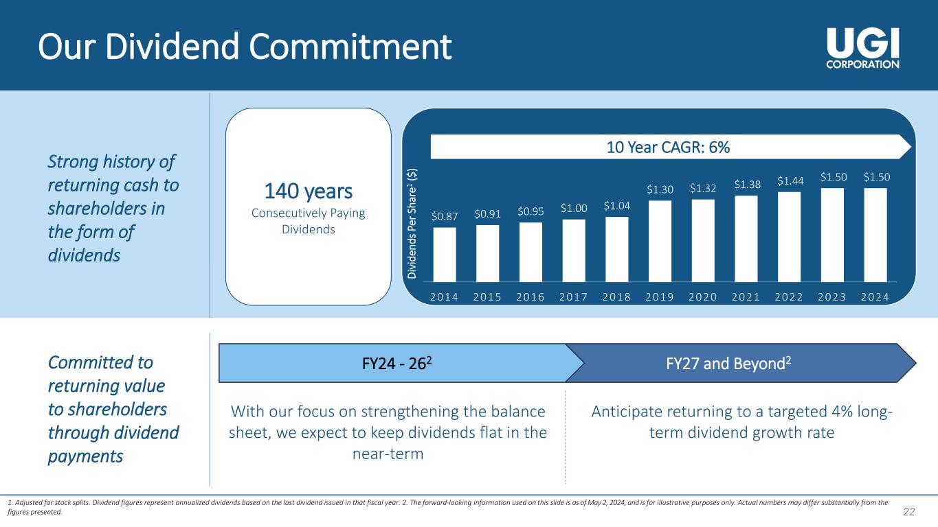 21 21 Capital Allocation Framework 21 ➢ Maintain commitment to the dividends ➢ Strong dividend payout ratio between 45% - 55% Shareholder Return ➢ Prioritize investments in the regulated utilities businesses, which attract a strong return on equity ➢ Support organic growth in the natural gas businesses through disciplined capital investment ➢ Maintain attractive liquidity to navigate market dynamics ➢ Target net debt to adjusted EBITDA (leverage ratio)1 between 3.5 – 4.0x2 ➢ Actively assess our portfolio to further maximize shareholder value ➢ Deploy capital for high-return, margin accretive transactions that provide a strategic fit, while maintaining a healthy balance sheet 1 2 3 High-Return Organic Growth Opportunities Balance Sheet Improvement Portfolio Optimization4 1. Adjusted EBITDA is a non-GAAP measure. 2. The forward-looking information used on this slide is for illustrative purposes only. Actual results may differ substantially from the information presented.