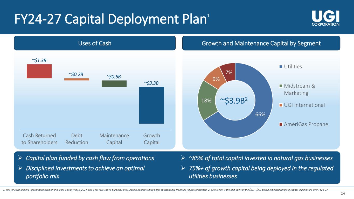 23 23 FY24 - 27 Financial Targets 23 1. The forward-looking information used on this slide is as of May 2, 2024, and is for illustrative purposes only. Actual numbers may differ substantially from the figures presented. 2. Defined as net debt to Adjusted EBITDA. Adjusted EBITDA is a non-GAAP measure. Executing on our strategy to deliver sustainable shareholder value 4 – 6% $3.7 - $4.1B 9%+ 3.5 – 4.0x EPS Growth Rate Capital Expenditure Rate Base Growth Rate Leverage Ratio2 1