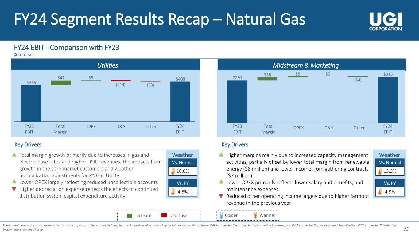 24 24 FY24-27 Capital Deployment Plan 24 1 66% 18% 9% 7% Utilities Midstream & Marketing UGI International AmeriGas Propane Uses of Cash Growth and Maintenance Capital by Segment ~$3.9B2 ➢ Capital plan funded by cash flow from operations ➢ Disciplined investments to achieve an optimal portfolio mix ~$0.2B ~$0.6B ~$3.3B ~$1.3B ➢ ~85% of total capital invested in natural gas businesses ➢ 75%+ of growth capital being deployed in the regulated utilities businesses 1. The forward-looking information used on this slide is as of May 2, 2024, and is for illustrative purposes only. Actual numbers may differ substantially from the figures presented. 2. $3.9 billion is the mid-point of the $3.7 - $4.1 billion expected range of capital expenditure over FY24-27.