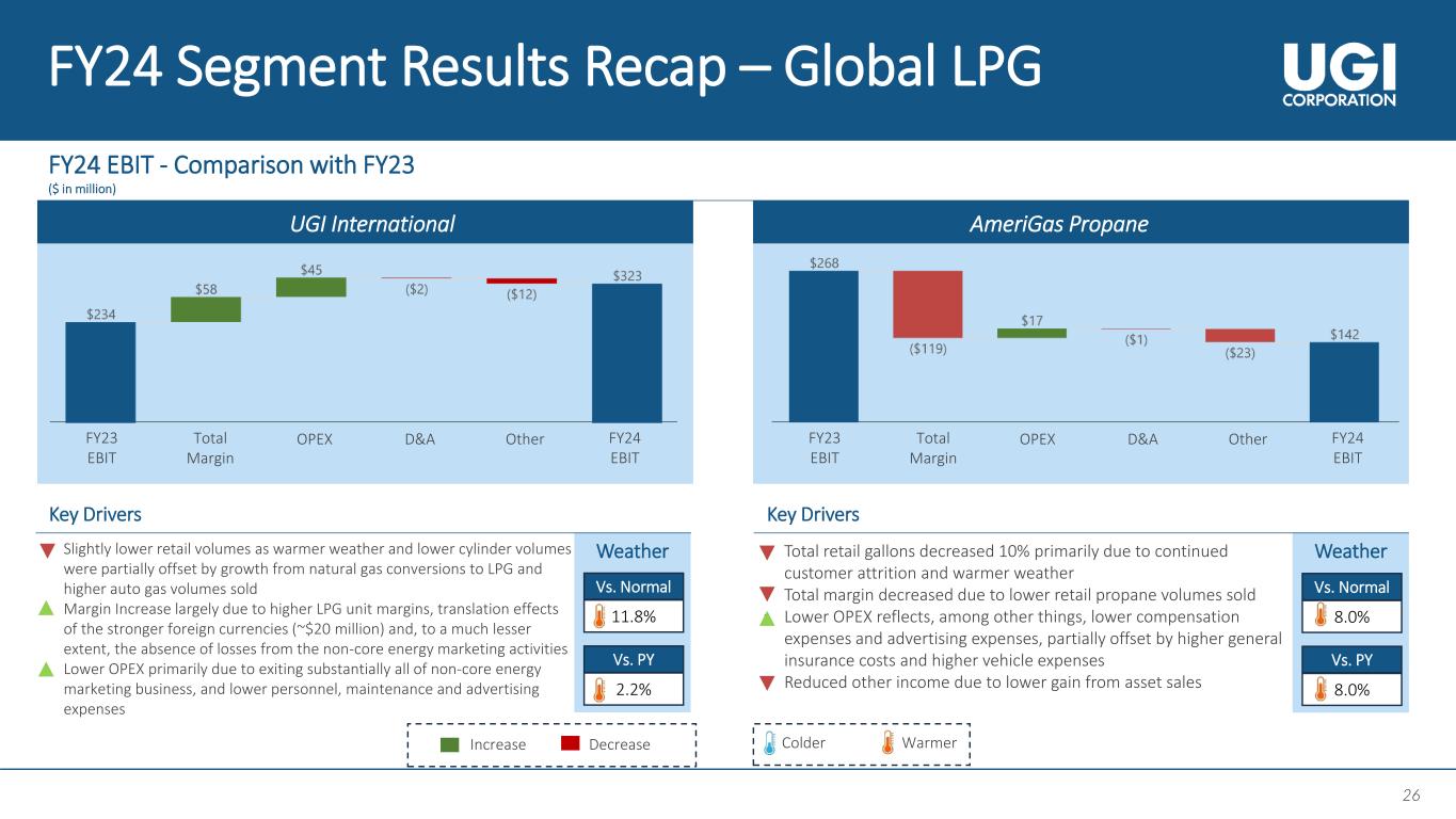 25 25 Weather Total margin represents total revenue less total cost of sales. In the case of Utilities, the total margin is also reduced by certain revenue-related taxes. OPEX stands for Operating & Administrative Expenses, and D&A stands for Depreciation and Amortization. DSIC stands for Distribution System Improvement Charge. FY24 Segment Results Recap – Natural Gas FY24 EBIT - Comparison with FY23 ($ in million) Utilities Key Drivers • Total margin growth primarily due to increases in gas and electric base rates and higher DSIC revenues, the impacts from growth in the core market customers and weather normalization adjustments for PA Gas Utility • Lower OPEX largely reflecting reduced uncollectible accounts • Higher depreciation expense reflects the effects of continued distribution system capital expenditure activity 16.0% 4.5% Vs. Normal Vs. PY Increase Decrease WarmerColder Weather Midstream & Marketing Key Drivers • Higher margins mainly due to increased capacity management activities, partially offset by lower total margin from renewable energy ($8 million) and lower income from gathering contracts ($7 million) • Lower OPEX primarily reflects lower salary and benefits, and maintenance expenses • Reduced other operating income largely due to higher farmout revenue in the previous year 13.3% 4.9% Vs. Normal Vs. PY FY23 EBIT FY24 EBIT Total Margin OPEX D&A Other FY23 EBIT FY24 EBIT Total Margin OPEX D&A Other