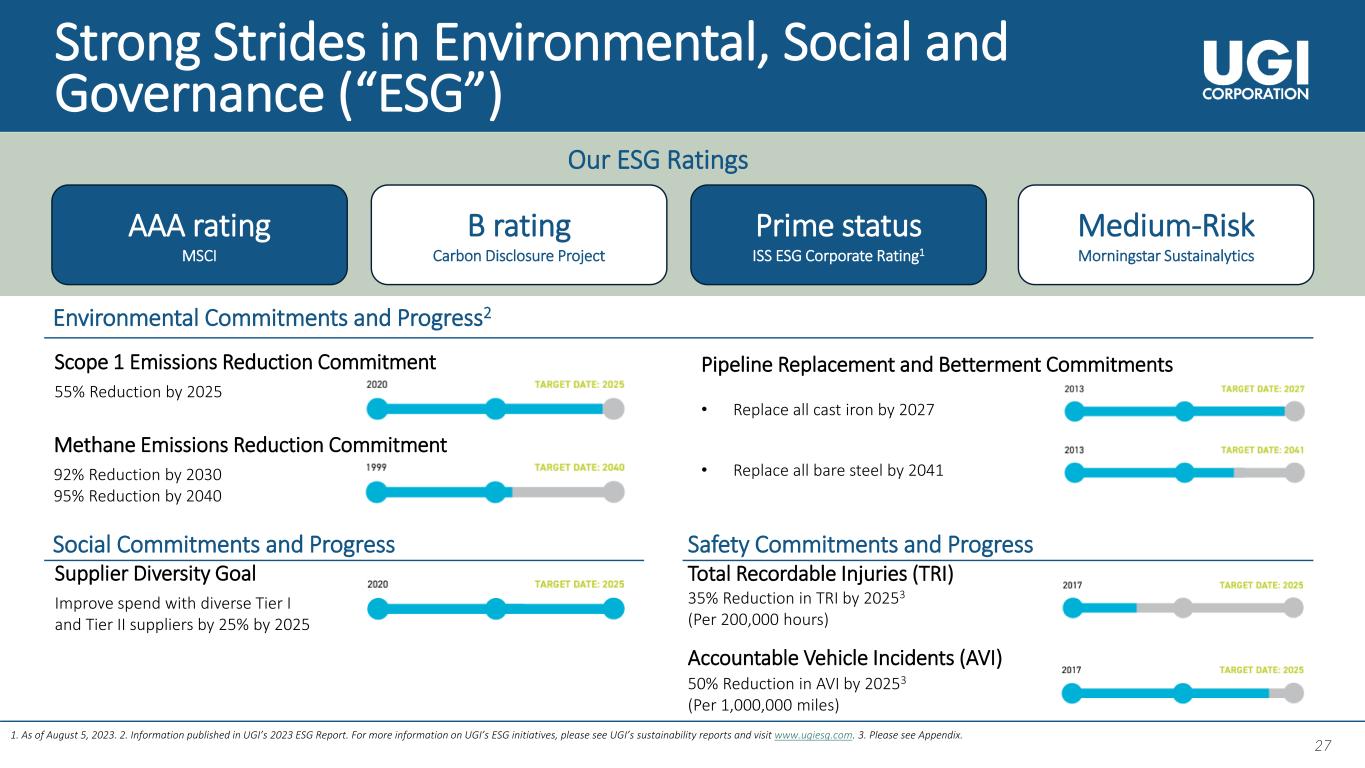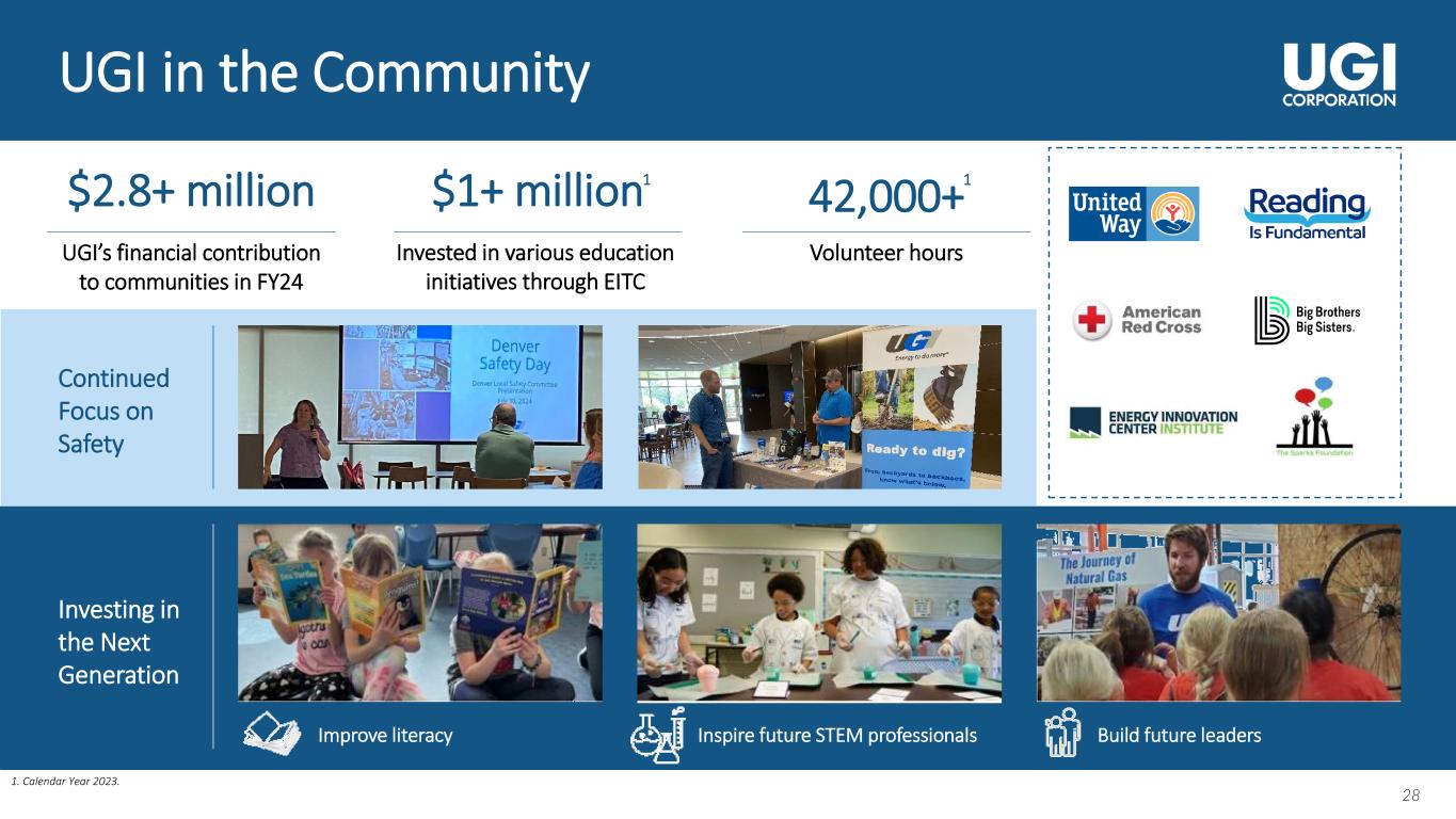 27 27 Strong Strides in Environmental, Social and Governance (“ESG”) AAA rating MSCI B rating Carbon Disclosure Project Prime status ISS ESG Corporate Rating1 Medium-Risk Morningstar Sustainalytics Our ESG Ratings 1. As of August 5, 2023. 2. Information published in UGI’s 2023 ESG Report. For more information on UGI’s ESG initiatives, please see UGI’s sustainability reports and visit www.ugiesg.com. 3. Please see Appendix. Supplier Diversity Goal Improve spend with diverse Tier I and Tier II suppliers by 25% by 2025 Social Commitments and Progress Safety Commitments and Progress Total Recordable Injuries (TRI) 35% Reduction in TRI by 20253 (Per 200,000 hours) Accountable Vehicle Incidents (AVI) 50% Reduction in AVI by 20253 (Per 1,000,000 miles) Environmental Commitments and Progress2 Scope 1 Emissions Reduction Commitment 55% Reduction by 2025 Pipeline Replacement and Betterment Commitments • Replace all cast iron by 2027 • Replace all bare steel by 2041 Methane Emissions Reduction Commitment 92% Reduction by 2030 95% Reduction by 2040