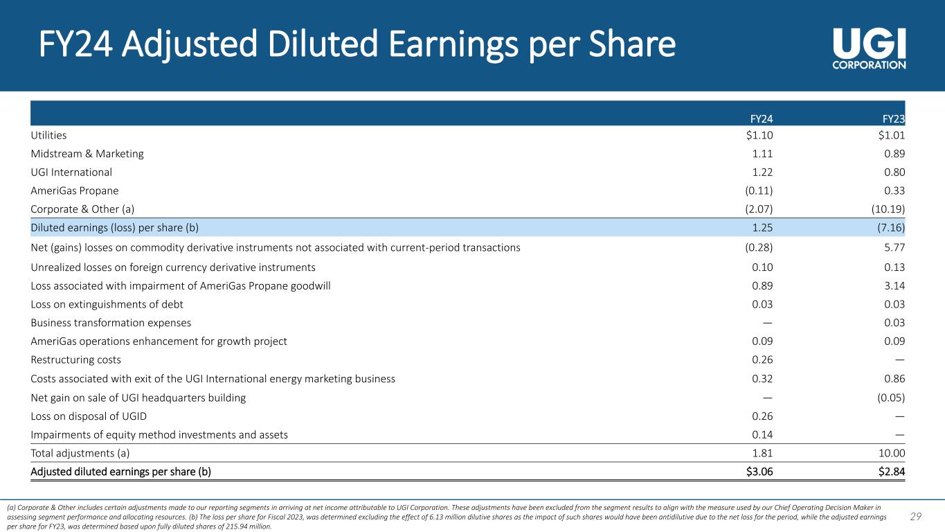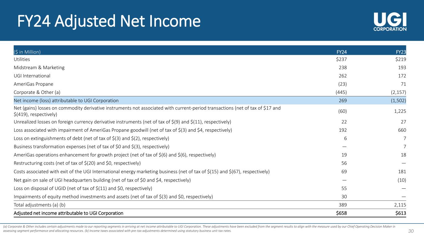 29 29 FY24 Adjusted Diluted Earnings per Share (a) Corporate & Other includes certain adjustments made to our reporting segments in arriving at net income attributable to UGI Corporation. These adjustments have been excluded from the segment results to align with the measure used by our Chief Operating Decision Maker in assessing segment performance and allocating resources. (b) The loss per share for Fiscal 2023, was determined excluding the effect of 6.13 million dilutive shares as the impact of such shares would have been antidilutive due to the net loss for the period, while the adjusted earnings per share for FY23, was determined based upon fully diluted shares of 215.94 million. FY24 FY23 Utilities $1.10 $1.01 Midstream & Marketing 1.11 0.89 UGI International 1.22 0.80 AmeriGas Propane (0.11) 0.33 Corporate & Other (a) (2.07) (10.19) Diluted earnings (loss) per share (b) 1.25 (7.16) Net (gains) losses on commodity derivative instruments not associated with current-period transactions (0.28) 5.77 Unrealized losses on foreign currency derivative instruments 0.10 0.13 Loss associated with impairment of AmeriGas Propane goodwill 0.89 3.14 Loss on extinguishments of debt 0.03 0.03 Business transformation expenses — 0.03 AmeriGas operations enhancement for growth project 0.09 0.09 Restructuring costs 0.26 — Costs associated with exit of the UGI International energy marketing business 0.32 0.86 Net gain on sale of UGI headquarters building — (0.05) Loss on disposal of UGID 0.26 — Impairments of equity method investments and assets 0.14 — Total adjustments (a) 1.81 10.00 Adjusted diluted earnings per share (b) $3.06 $2.84