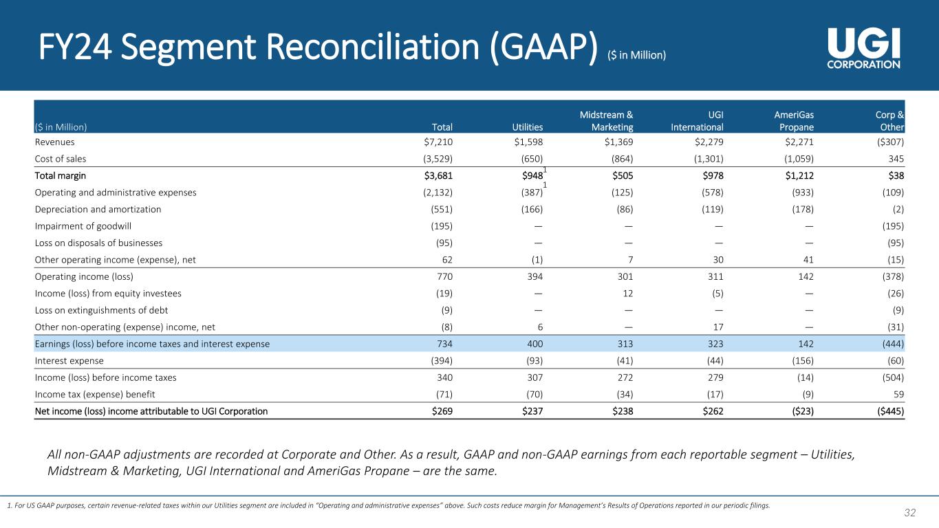 31 31 Midstream and Marketing Margin (non-GAAP) ($ in Million) FY24 FY23 FY22 FY21 FY20 Total Revenues $1,369 $1,847 $2,326 $1,406 $1,247 Less: Total Cost of Sales (864) (1,360) (1,876) (1,033) (892) Margin - Midstream & Marketing $505 $487 $450 $373 $355 Less: HVAC - - - - (21) UGI Energy Services Margin $505 $487 $450 $373 $334