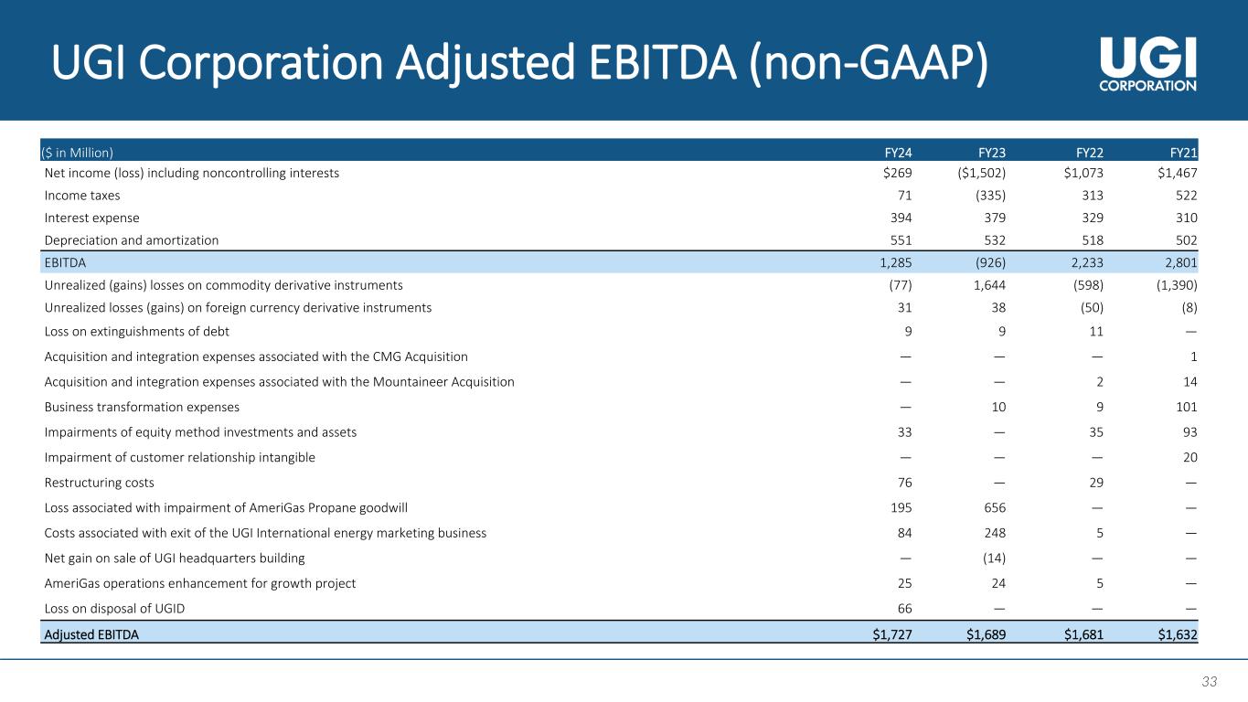 32 32 ($ in Million) Total Utilities Midstream & Marketing UGI International AmeriGas Propane Corp & Other Revenues $7,210 $1,598 $1,369 $2,279 $2,271 ($307) Cost of sales (3,529) (650) (864) (1,301) (1,059) 345 Total margin $3,681 $948 $505 $978 $1,212 $38 Operating and administrative expenses (2,132) (387) (125) (578) (933) (109) Depreciation and amortization (551) (166) (86) (119) (178) (2) Impairment of goodwill (195) — — — — (195) Loss on disposals of businesses (95) — — — — (95) Other operating income (expense), net 62 (1) 7 30 41 (15) Operating income (loss) 770 394 301 311 142 (378) Income (loss) from equity investees (19) — 12 (5) — (26) Loss on extinguishments of debt (9) — — — — (9) Other non-operating (expense) income, net (8) 6 — 17 — (31) Earnings (loss) before income taxes and interest expense 734 400 313 323 142 (444) Interest expense (394) (93) (41) (44) (156) (60) Income (loss) before income taxes 340 307 272 279 (14) (504) Income tax (expense) benefit (71) (70) (34) (17) (9) 59 Net income (loss) income attributable to UGI Corporation $269 $237 $238 $262 ($23) ($445) FY24 Segment Reconciliation (GAAP) ($ in Million) 1. For US GAAP purposes, certain revenue-related taxes within our Utilities segment are included in “Operating and administrative expenses” above. Such costs reduce margin for Management’s Results of Operations reported in our periodic filings. 1 1 All non-GAAP adjustments are recorded at Corporate and Other. As a result, GAAP and non-GAAP earnings from each reportable segment – Utilities, Midstream & Marketing, UGI International and AmeriGas Propane – are the same.