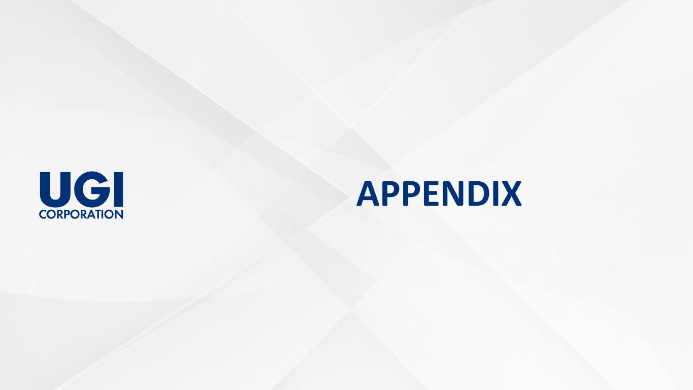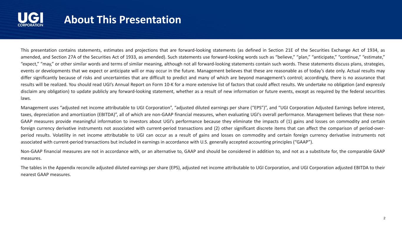 About This Presentation 2 This presentation contains statements, estimates and projections that are forward-looking statements (as defined in Section 21E of the Securities Exchange Act of 1934, as amended, and Section 27A of the Securities Act of 1933, as amended). Such statements use forward-looking words such as “believe,” “plan,” “anticipate,” “continue,” “estimate,” “expect,” “may,” or other similar words and terms of similar meaning, although not all forward-looking statements contain such words. These statements discuss plans, strategies, events or developments that we expect or anticipate will or may occur in the future. Management believes that these are reasonable as of today’s date only. Actual results may differ significantly because of risks and uncertainties that are difficult to predict and many of which are beyond management’s control; accordingly, there is no assurance that results will be realized. You should read UGI’s Annual Report on Form 10-K for a more extensive list of factors that could affect results. We undertake no obligation (and expressly disclaim any obligation) to update publicly any forward-looking statement, whether as a result of new information or future events, except as required by the federal securities laws. Management uses “adjusted net income attributable to UGI Corporation”, “adjusted diluted earnings per share (“EPS”)”, and “UGI Corporation Adjusted Earnings before interest, taxes, depreciation and amortization (EBITDA)”, all of which are non-GAAP financial measures, when evaluating UGI's overall performance. Management believes that these non- GAAP measures provide meaningful information to investors about UGI’s performance because they eliminate the impacts of (1) gains and losses on commodity and certain foreign currency derivative instruments not associated with current-period transactions and (2) other significant discrete items that can affect the comparison of period-over- period results. Volatility in net income attributable to UGI can occur as a result of gains and losses on commodity and certain foreign currency derivative instruments not associated with current-period transactions but included in earnings in accordance with U.S. generally accepted accounting principles (“GAAP”). Non-GAAP financial measures are not in accordance with, or an alternative to, GAAP and should be considered in addition to, and not as a substitute for, the comparable GAAP measures. The tables in the Appendix reconcile adjusted diluted earnings per share (EPS), adjusted net income attributable to UGI Corporation, and UGI Corporation adjusted EBITDA to their nearest GAAP measures.