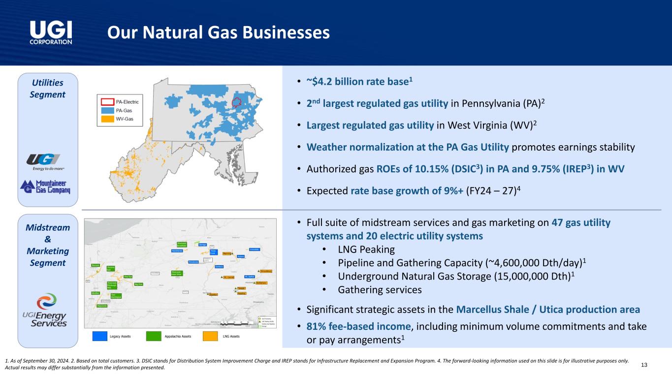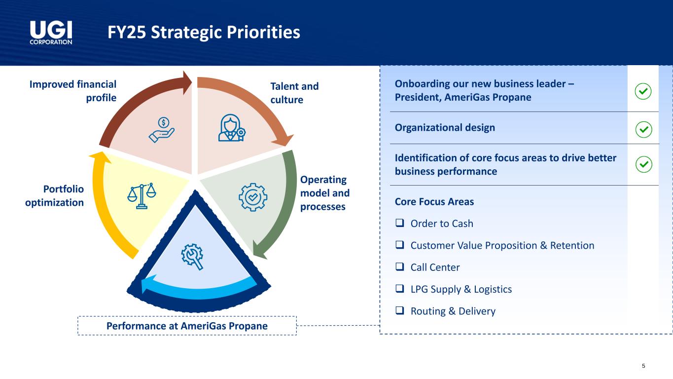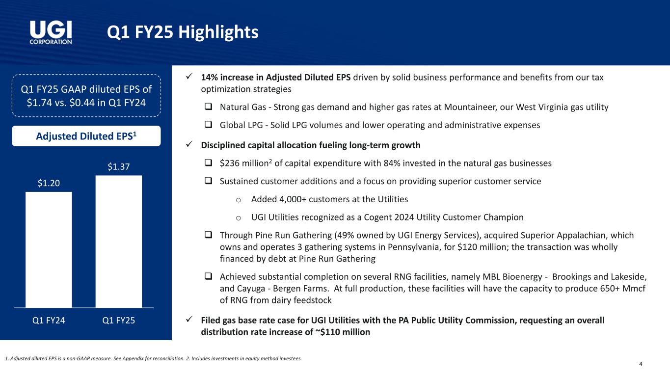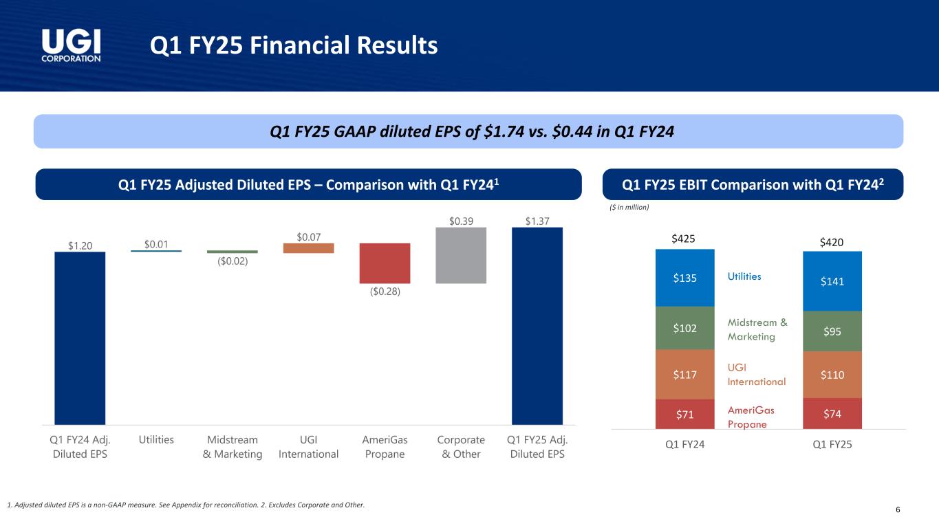 Q1 FY25 Highlights Adjusted Diluted EPS1 Q1 FY25 GAAP diluted EPS of $1.74 vs. $0.44 in Q1 FY24 $1.20 $1.37 Q1 FY24 Q1 FY25 1. Adjusted diluted EPS is a non-GAAP measure. See Appendix for reconciliation. 2. Includes investments in equity method investees. ✓ 14% increase in Adjusted Diluted EPS driven by solid business performance and benefits from our tax optimization strategies ❑ Natural Gas - Strong gas demand and higher gas rates at Mountaineer, our West Virginia gas utility ❑ Global LPG - Solid LPG volumes and lower operating and administrative expenses ✓ Disciplined capital allocation fueling long-term growth ❑ $236 million2 of capital expenditure with 84% invested in the natural gas businesses ❑ Sustained customer additions and a focus on providing superior customer service o Added 4,000+ customers at the Utilities o UGI Utilities recognized as a Cogent 2024 Utility Customer Champion ❑ Through Pine Run Gathering (49% owned by UGI Energy Services), acquired Superior Appalachian, which owns and operates 3 gathering systems in Pennsylvania, for $120 million; the transaction was wholly financed by debt at Pine Run Gathering ❑ Achieved substantial completion on several RNG facilities, namely MBL Bioenergy - Brookings and Lakeside, and Cayuga - Bergen Farms. At full production, these facilities will have the capacity to produce 650+ Mmcf of RNG from dairy feedstock ✓ Filed gas base rate case for UGI Utilities with the PA Public Utility Commission, requesting an overall distribution rate increase of ~$110 million 4