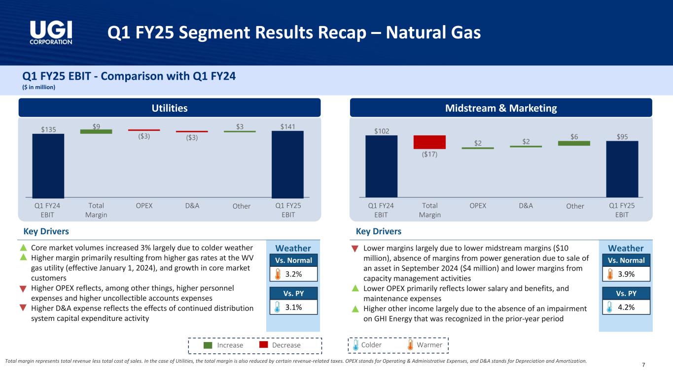 Q1 FY25 Financial Results Q1 FY25 GAAP diluted EPS of $1.74 vs. $0.44 in Q1 FY24 Q1 FY25 Adjusted Diluted EPS – Comparison with Q1 FY241 Q1 FY25 EBIT Comparison with Q1 FY242 $71 $74 $117 $110 $102 $95 $135 $141 Q1 FY24 Q1 FY25 $425 $420 1. Adjusted diluted EPS is a non-GAAP measure. See Appendix for reconciliation. 2. Excludes Corporate and Other. Utilities Midstream & Marketing UGI International AmeriGas Propane 6 ($ in million)