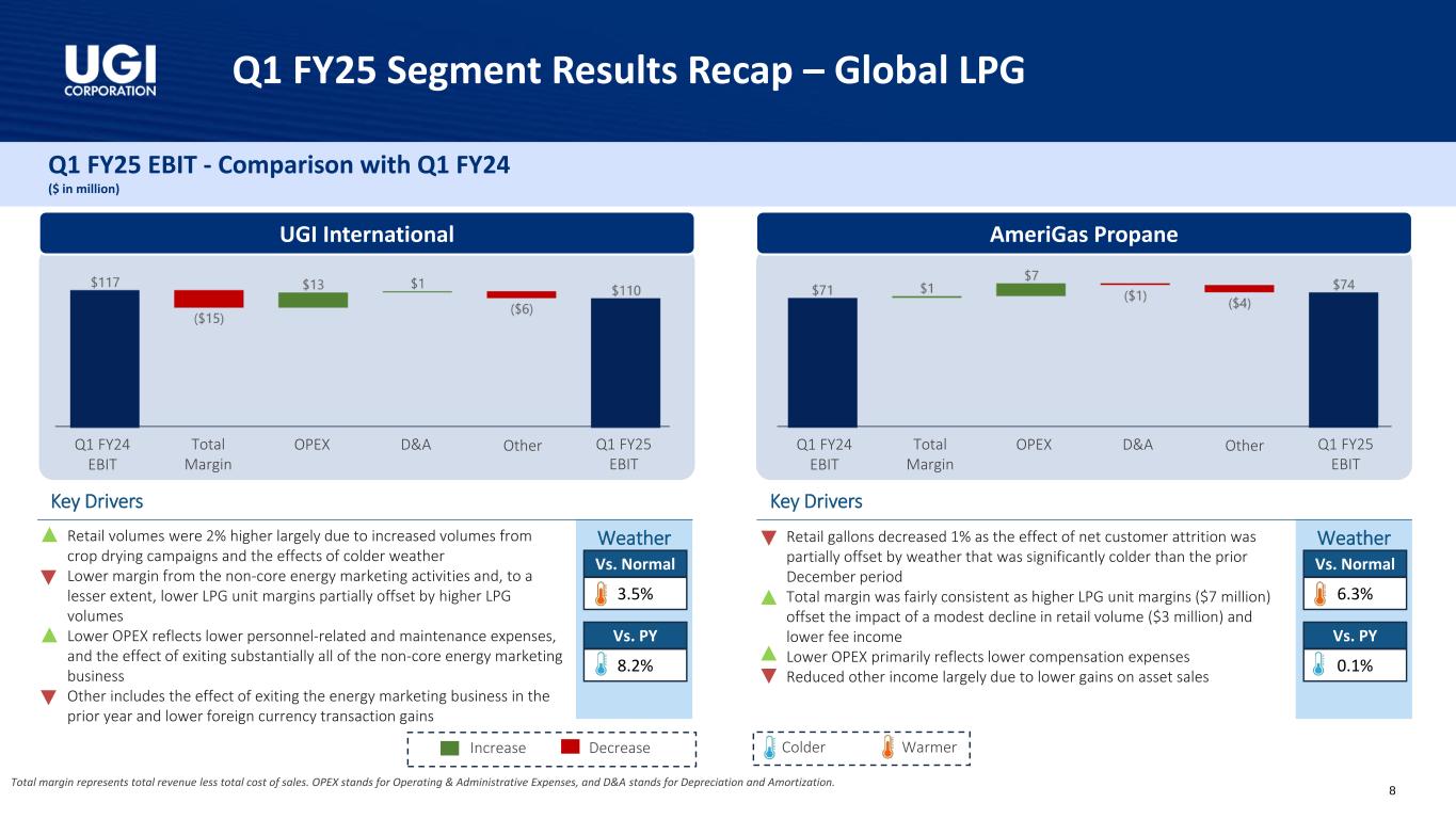 Q1 FY25 Segment Results Recap – Natural Gas Q1 FY25 EBIT - Comparison with Q1 FY24 ($ in million) Utilities Midstream & Marketing Weather Total margin represents total revenue less total cost of sales. In the case of Utilities, the total margin is also reduced by certain revenue-related taxes. OPEX stands for Operating & Administrative Expenses, and D&A stands for Depreciation and Amortization. Key Drivers • Core market volumes increased 3% largely due to colder weather • Higher margin primarily resulting from higher gas rates at the WV gas utility (effective January 1, 2024), and growth in core market customers • Higher OPEX reflects, among other things, higher personnel expenses and higher uncollectible accounts expenses • Higher D&A expense reflects the effects of continued distribution system capital expenditure activity 3.2% 3.1% Vs. Normal Vs. PY Increase Decrease WarmerColder Weather Key Drivers • Lower margins largely due to lower midstream margins ($10 million), absence of margins from power generation due to sale of an asset in September 2024 ($4 million) and lower margins from capacity management activities • Lower OPEX primarily reflects lower salary and benefits, and maintenance expenses • Higher other income largely due to the absence of an impairment on GHI Energy that was recognized in the prior-year period 3.9% 4.2% Vs. Normal Vs. PY Q1 FY24 EBIT Q1 FY25 EBIT Total Margin OPEX D&A Other Q1 FY24 EBIT Q1 FY25 EBIT Total Margin OPEX D&A Other 7