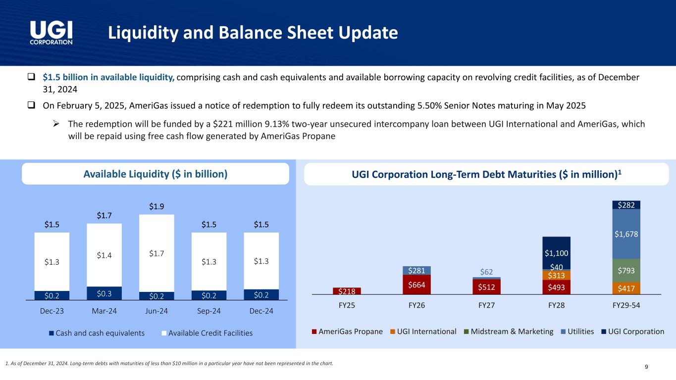Q1 FY25 Segment Results Recap – Global LPG Q1 FY25 EBIT - Comparison with Q1 FY24 ($ in million) UGI International AmeriGas Propane Weather Key Drivers • Retail volumes were 2% higher largely due to increased volumes from crop drying campaigns and the effects of colder weather • Lower margin from the non-core energy marketing activities and, to a lesser extent, lower LPG unit margins partially offset by higher LPG volumes • Lower OPEX reflects lower personnel-related and maintenance expenses, and the effect of exiting substantially all of the non-core energy marketing business • Other includes the effect of exiting the energy marketing business in the prior year and lower foreign currency transaction gains Increase Decrease WarmerColder Weather Key Drivers • Retail gallons decreased 1% as the effect of net customer attrition was partially offset by weather that was significantly colder than the prior December period • Total margin was fairly consistent as higher LPG unit margins ($7 million) offset the impact of a modest decline in retail volume ($3 million) and lower fee income • Lower OPEX primarily reflects lower compensation expenses • Reduced other income largely due to lower gains on asset sales 3.5% 8.2% Vs. Normal Vs. PY 6.3% 0.1% Vs. Normal Vs. PY Q1 FY24 EBIT Q1 FY25 EBIT Total Margin OPEX D&A Other Q1 FY24 EBIT Q1 FY25 EBIT Total Margin OPEX D&A Other 8 Total margin represents total revenue less total cost of sales. OPEX stands for Operating & Administrative Expenses, and D&A stands for Depreciation and Amortization.