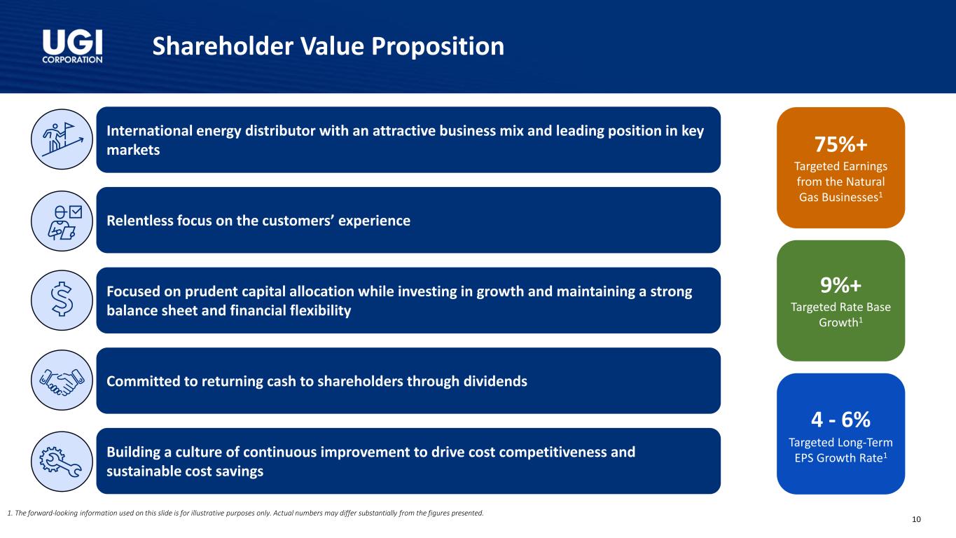 Liquidity and Balance Sheet Update 1. As of December 31, 2024. Long-term debts with maturities of less than $10 million in a particular year have not been represented in the chart. ❑ $1.5 billion in available liquidity, comprising cash and cash equivalents and available borrowing capacity on revolving credit facilities, as of December 31, 2024 ❑ On February 5, 2025, AmeriGas issued a notice of redemption to fully redeem its outstanding 5.50% Senior Notes maturing in May 2025 ➢ The redemption will be funded by a $221 million 9.13% two-year unsecured intercompany loan between UGI International and AmeriGas, which will be repaid using free cash flow generated by AmeriGas Propane UGI Corporation Long-Term Debt Maturities ($ in million)1Available Liquidity ($ in billion) $0.2 $0.3 $0.2 $0.2 $0.2 $1.3 $1.4 $1.7 $1.3 $1.3 $1.5 $1.7 $1.9 $1.5 $1.5 Dec-23 Mar-24 Jun-24 Sep-24 Dec-24 Cash and cash equivalents Available Credit Facilities 9 $218 $664 $512 $493 $313 $417 $793 $281 $62 $40 $1,678 $1,100 $282 FY25 FY26 FY27 FY28 FY29-54 AmeriGas Propane UGI International Midstream & Marketing Utilities UGI Corporation