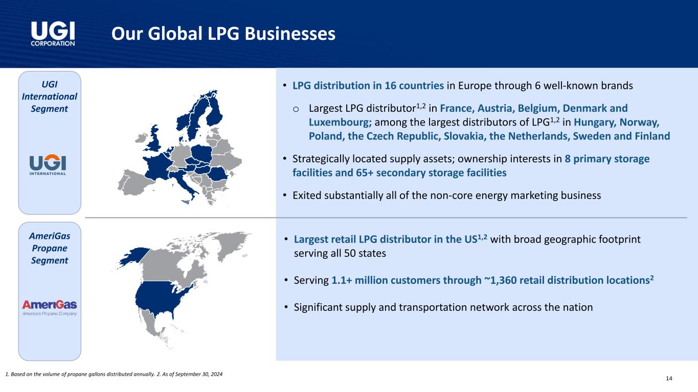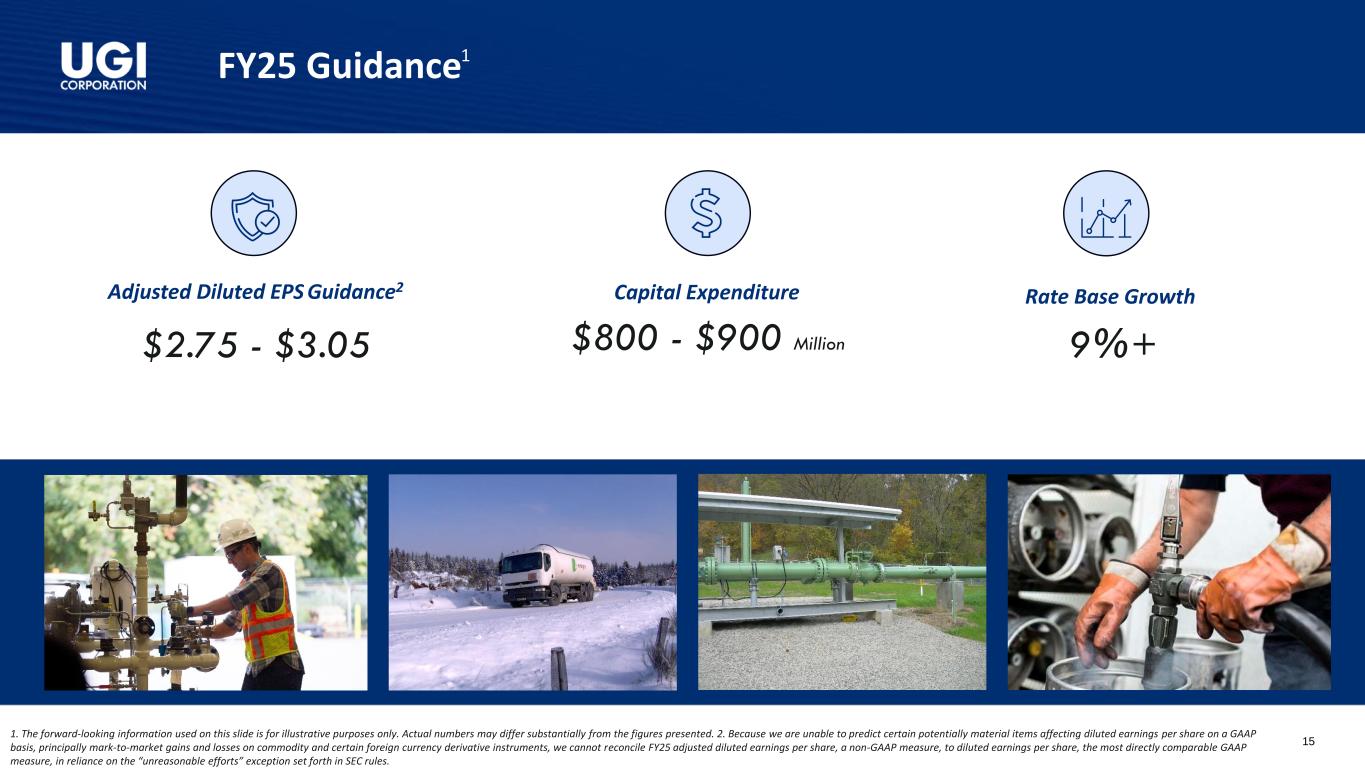 Our Global LPG Businesses UGI International Segment AmeriGas Propane Segment • LPG distribution in 16 countries in Europe through 6 well-known brands o Largest LPG distributor1,2 in France, Austria, Belgium, Denmark and Luxembourg; among the largest distributors of LPG1,2 in Hungary, Norway, Poland, the Czech Republic, Slovakia, the Netherlands, Sweden and Finland • Strategically located supply assets; ownership interests in 8 primary storage facilities and 65+ secondary storage facilities • Exited substantially all of the non-core energy marketing business • Largest retail LPG distributor in the US1,2 with broad geographic footprint serving all 50 states • Serving 1.1+ million customers through ~1,360 retail distribution locations2 • Significant supply and transportation network across the nation 1. Based on the volume of propane gallons distributed annually. 2. As of September 30, 2024 14