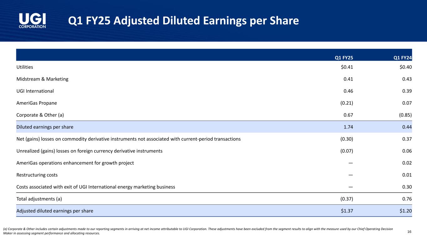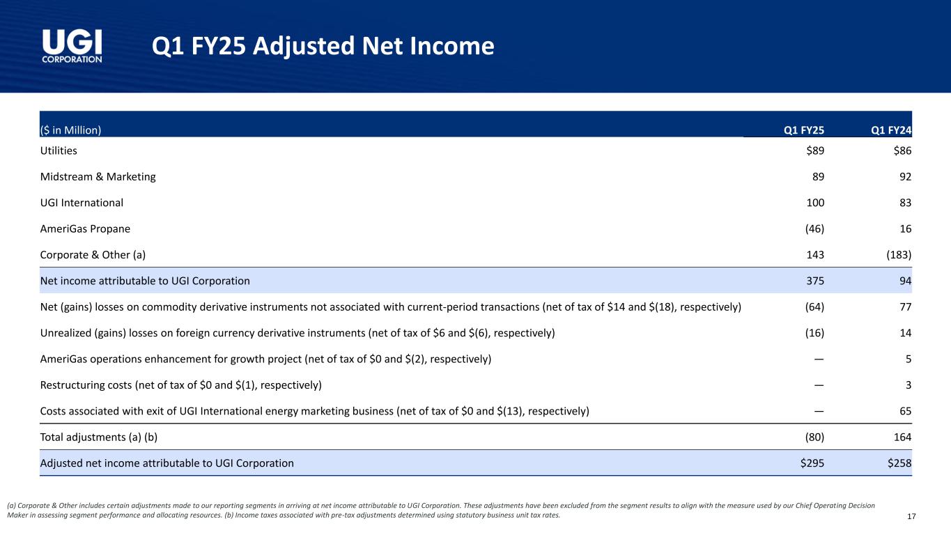 Q1 FY25 Adjusted Diluted Earnings per Share (a) Corporate & Other includes certain adjustments made to our reporting segments in arriving at net income attributable to UGI Corporation. These adjustments have been excluded from the segment results to align with the measure used by our Chief Operating Decision Maker in assessing segment performance and allocating resources. 16 Q1 FY25 Q1 FY24 Utilities $0.41 $0.40 Midstream & Marketing 0.41 0.43 UGI International 0.46 0.39 AmeriGas Propane (0.21) 0.07 Corporate & Other (a) 0.67 (0.85) Diluted earnings per share 1.74 0.44 Net (gains) losses on commodity derivative instruments not associated with current-period transactions (0.30) 0.37 Unrealized (gains) losses on foreign currency derivative instruments (0.07) 0.06 AmeriGas operations enhancement for growth project — 0.02 Restructuring costs — 0.01 Costs associated with exit of UGI International energy marketing business — 0.30 Total adjustments (a) (0.37) 0.76 Adjusted diluted earnings per share $1.37 $1.20