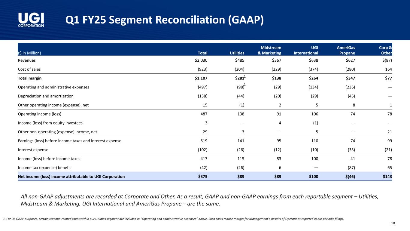 Q1 FY25 Adjusted Net Income (a) Corporate & Other includes certain adjustments made to our reporting segments in arriving at net income attributable to UGI Corporation. These adjustments have been excluded from the segment results to align with the measure used by our Chief Operating Decision Maker in assessing segment performance and allocating resources. (b) Income taxes associated with pre-tax adjustments determined using statutory business unit tax rates. 17 ($ in Million) Q1 FY25 Q1 FY24 Utilities $89 $86 Midstream & Marketing 89 92 UGI International 100 83 AmeriGas Propane (46) 16 Corporate & Other (a) 143 (183) Net income attributable to UGI Corporation 375 94 Net (gains) losses on commodity derivative instruments not associated with current-period transactions (net of tax of $14 and $(18), respectively) (64) 77 Unrealized (gains) losses on foreign currency derivative instruments (net of tax of $6 and $(6), respectively) (16) 14 AmeriGas operations enhancement for growth project (net of tax of $0 and $(2), respectively) — 5 Restructuring costs (net of tax of $0 and $(1), respectively) — 3 Costs associated with exit of UGI International energy marketing business (net of tax of $0 and $(13), respectively) — 65 Total adjustments (a) (b) (80) 164 Adjusted net income attributable to UGI Corporation $295 $258